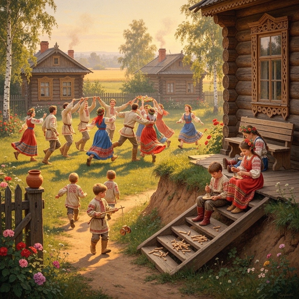 🌾 «Лён», «Мак», «Просо». Целый цикл игр, воспроизводящих сельскохозяйственные работы. Играя в них, дети не просто узнавали, как сеять и убирать урожай, но и закладывали в подсознание сакральный смысл круговорота жизни, смерти и возрождения зерна.
