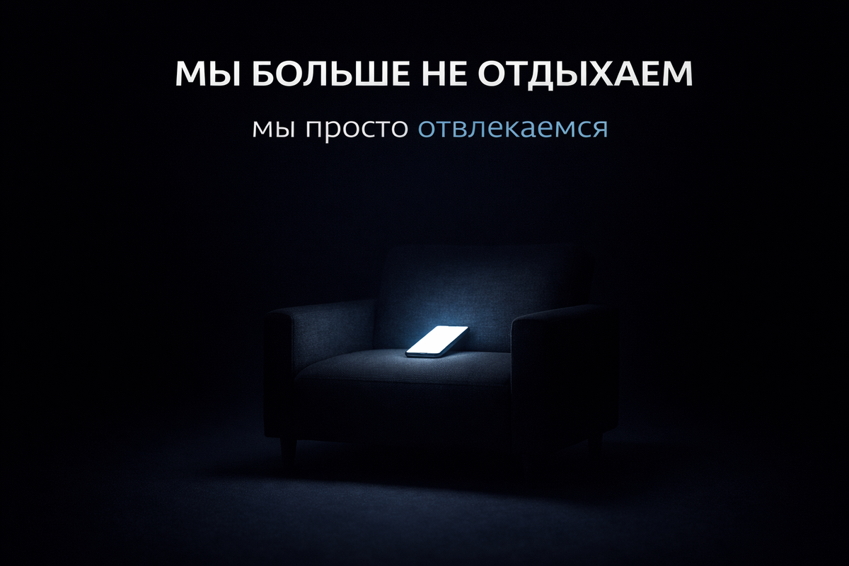 Три. Вы «ничего не делали». Но почему тогда усталость не ушла? Потому что вы не отдыхали. Вы отвлекались. И это две совершенно разные вещи. Настоящий отдых: Отвлечение: Когда вы листаете ленту, мозг продолжает работать. Когда вы смотрите сериал в фоновом режиме — вы не расслабляетесь, вы стимулируетесь. Это не пауза.