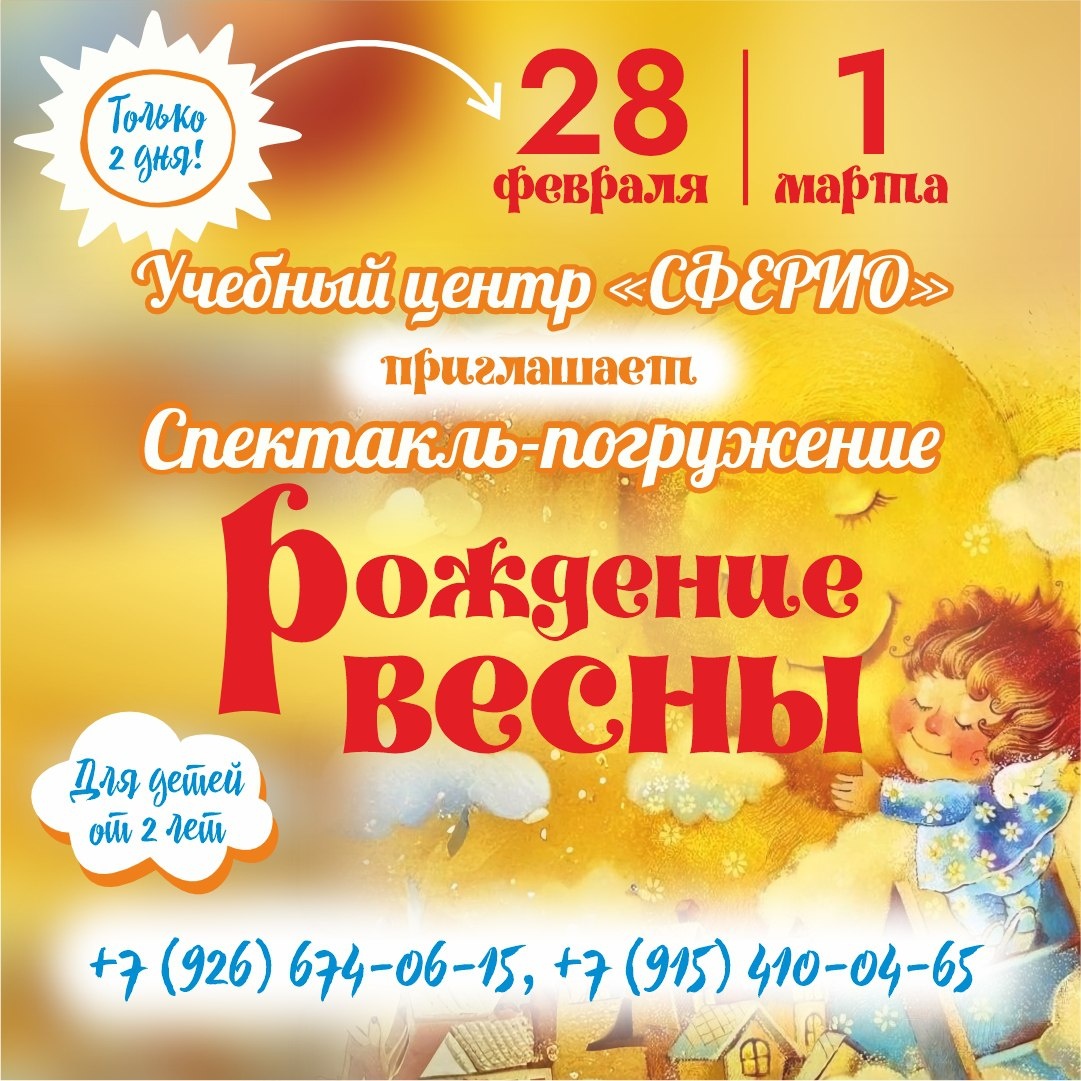 ✨ ‼️ВНИМАНИЕ! Спектакль-Погружение "РОЖДЕНИЕ ВЕСНЫ" ☀️Приглашаем детей от 2-7 лет ✨Интерактивный спектакль подарит детям незабываемые впечатления и знакомство с удивительным миром весны🌼 ‼️Успейте забронировать билеты! 🎈Интерактивное представление 🎭Встреча со сказочными героями Мастер-Класс 📆 28.02.2026 🕛 11:00 🏢 Учебный центр "Сферио" 📍 г. Чехов,ул. Полиграфистов, 6 (Вход со двора, подъезд 2, этаж 3) 🔗 Записаться: https://t.me/Sferio_Chekhov Наши соцсети 📲⬇️ ➡️ ВК https://vk.com/sferio_kids ➡️ ТГ https://dzen.ru/id/672e115c65592e5989376c34 ➡️ Продленка https://vk.com/prodlenkachehov ➡️ Школа https://vk.com/sferio_school 🎁Забрать подарок:🎁 https://t.me/bot_sferio_bot ⭐Поддержать канал голосом #спектакльЧехов #детямЧехов #интересноЧехов ✅ Мероприятия Чехов https://dzen.ru/id/66cc4b48e9ef144699238a51 http://vk.com/chekhov_events http://dzen.ru/chekhov_events
