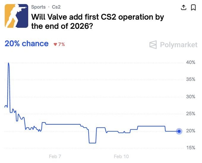 🤔 По данным Polymarket, сейчас вероятность того, что в 2026 году в CS2 выйдет операция, составляет 20%