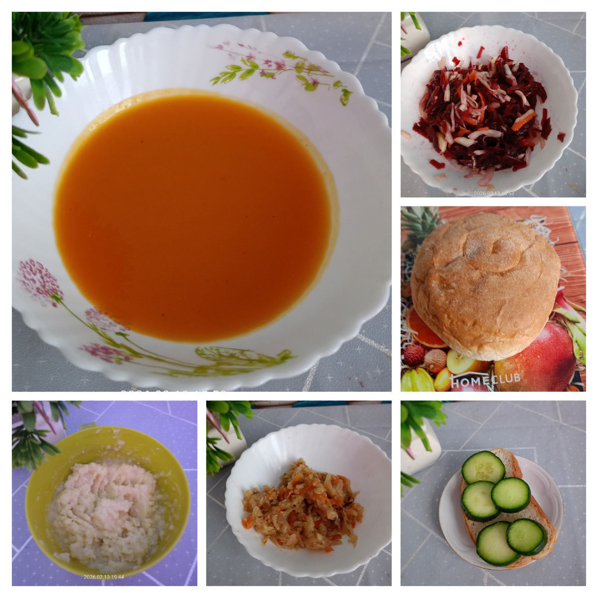 •Обед в 16.00 - суп пюре из тыквы; свёкла отварная с квашеной капустой и маслом; булочка пшеничная; тушёная капуста и бутерброд со свежим огурцом.