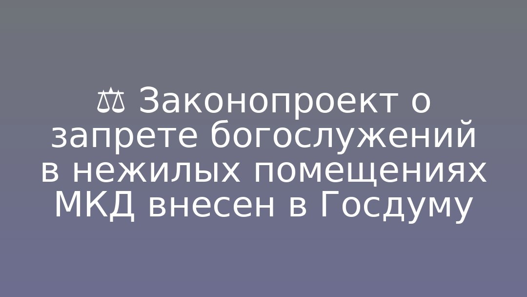 , религиозных обрядов, церемоний и молитвенных собраний в нежилых помещениях многоквартирных домов и в пристроенных к ним помещениях. Среди соавторов — лидеры фракций, кроме «Единой России»: Геннадий Зюганов, Леонид Слуцкий, Сергей Миронов, Алексей Нечаев; также вице-спикер Госдумы Петр Толстой («Единая Россия»). Проект предусматривает, что богослужения в жилых помещениях допускаются лишь для удовлетворения индивидуальных духовных потребностей законно проживающих там лиц. Корреспондирующие изменения планируется внести в Жилищный кодекс.