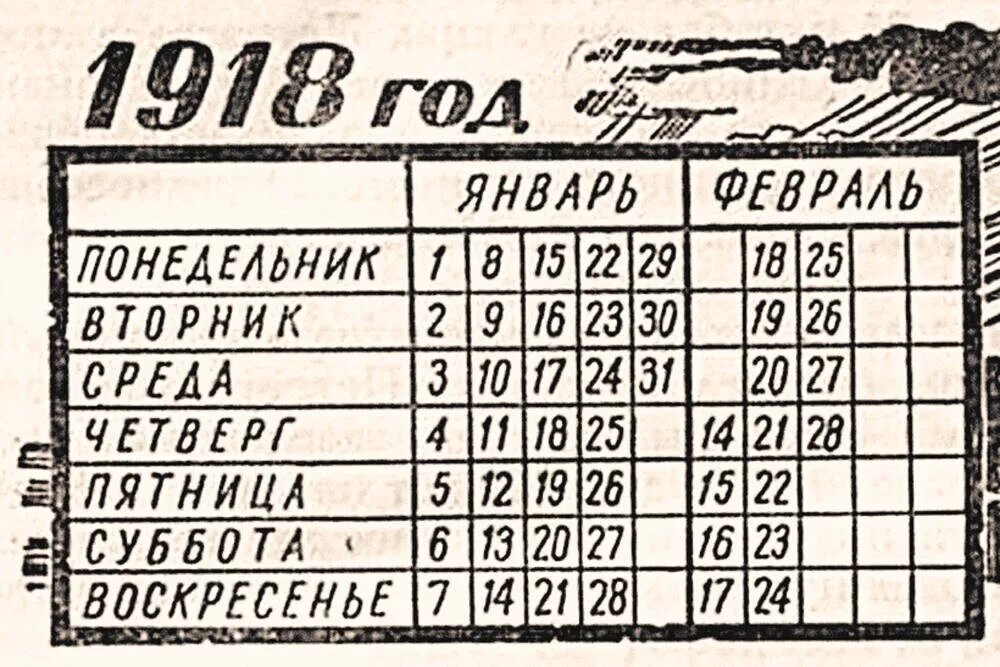 24 января (6 февраля) 1918 года был принят исторический «Декрет о введении в Российской республике западноевропейского календаря». Формулировка была предельно четкой и не допускала двойных толкований: «Первый день после 31 января сего года считать не 1 февраля, а 14 февраля, второй день — считать 15-м и т. д.».
