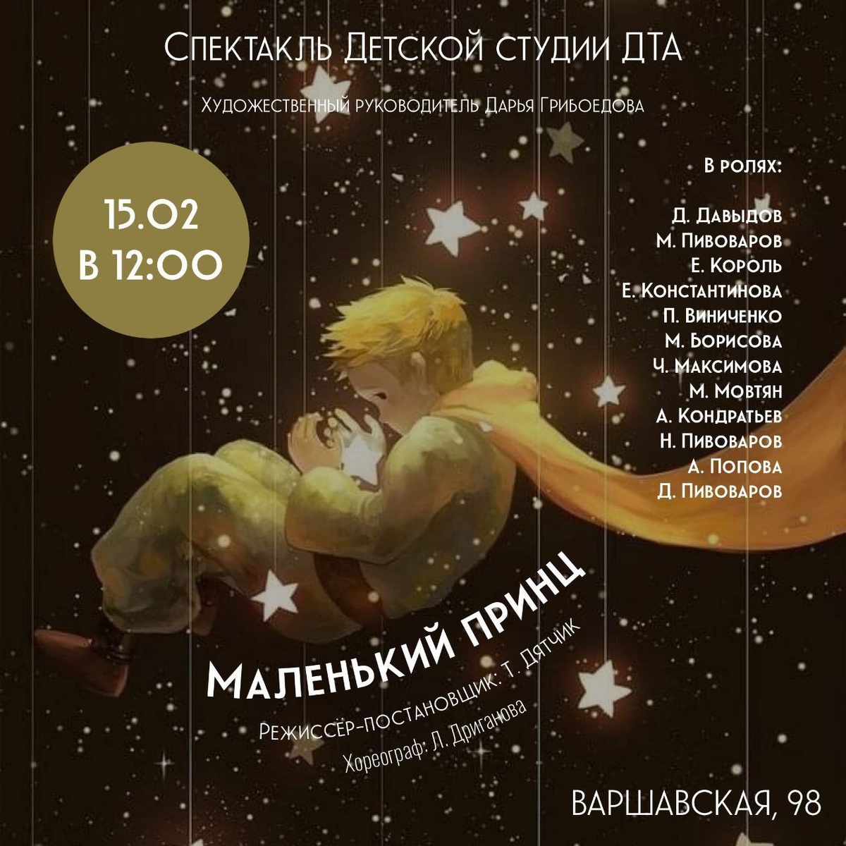 15 февраля я в 12:00 - детская студии Драматического театра антреприз представляет трогательную и мудрую историю о дружбе, любви и поиске смысла жизни – "Маленький принц" по мотивам знаменитой сказки Антуана де Сент-Экзюпери. Гостей ждет трогательная история о дружбе, любви, ответственности и настоящих ценностях, рассказанная юными, но талантливыми актерами. Вместе с Маленьким принцем гости отправятся в увлекательное путешествие по разным планетам, познакомитесь с их обитателями и задумаетесь о самых важных вопросах бытия. 📌Вход свободный ☎Справки по телефону: 373-29-91 📍Ждём вас по адресу: ул. Варшавская д. 98 (вход со двора) #Спектакль_В98 #ART_Каникулы