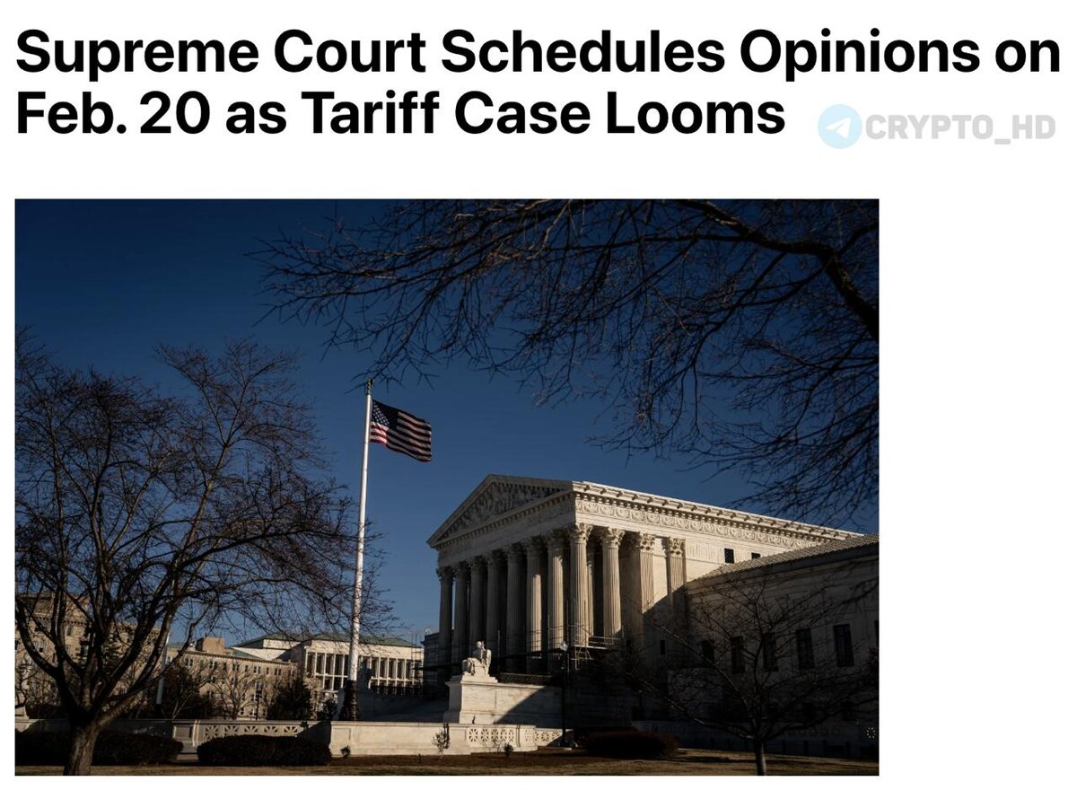 Верховный суд США назначил вероятные даты оглашения решения, способного отменить большую часть тарифов, введенных президентом. Сейчас спорные тарифы приносят бюджету более $16b в месяц. К 20 февраля общий объем сборов может превысить $170b. В Белом доме заявили, что при отмене тарифов оперативно задействуют другие правовые основания для введения новых пошлин. Ранее: - запасной план - разрушительные последствия - суд отменит пошлины - суд проявил скепсис - «вопрос жизни и смерти» Crypto Headlines