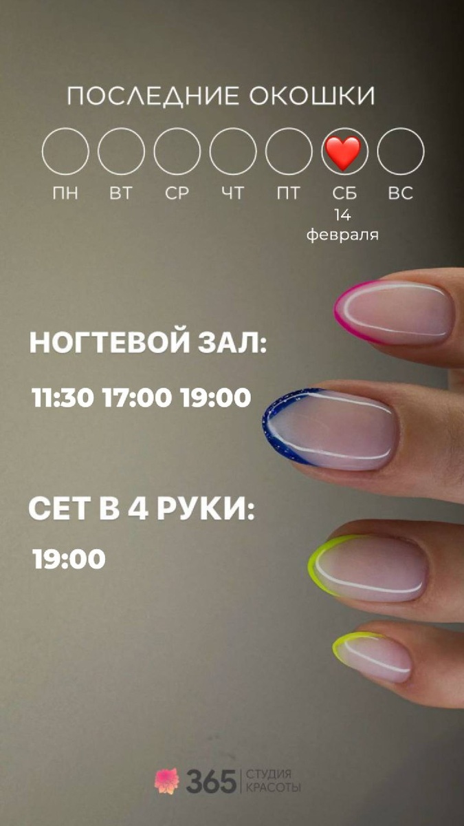 🤗 Пусть эти выходные подарят вам массу положительных эмоций и незабываемых моментов!💯😇❤️ #красота #наслаждение #забота #зима #любовь #мечты сбываются #радость #возможности ЧТО МОЖНО УСПЕТЬ СДЕЛАТЬ 14 февраля 2026 года : Ногтевой зал: 11:30 17:00 19:00 Сет в 4 руки: 19:00 Парикмахерский зал: 20:00 Оформление бровей и ресниц: 11:00 13:00 16:00 18:00 20:00 Косметология/шугаринг: 11:00 16:00 17:00 19:00 ЗАПИСАТЬСЯ МОЖНО ЛЮБЫМ УДОБНЫМ СПОСОБОМ: 👉🏻 Сообщение в Whats'app https://wa.me/79663654477 👉🏻По телефону +79663654477 👉🏻Онлайн запись https://n286444.yclients.com/ #команда365 #красота #наслаждение #забота #зима #январь #любовь #мечтысбываются #радость #возможности