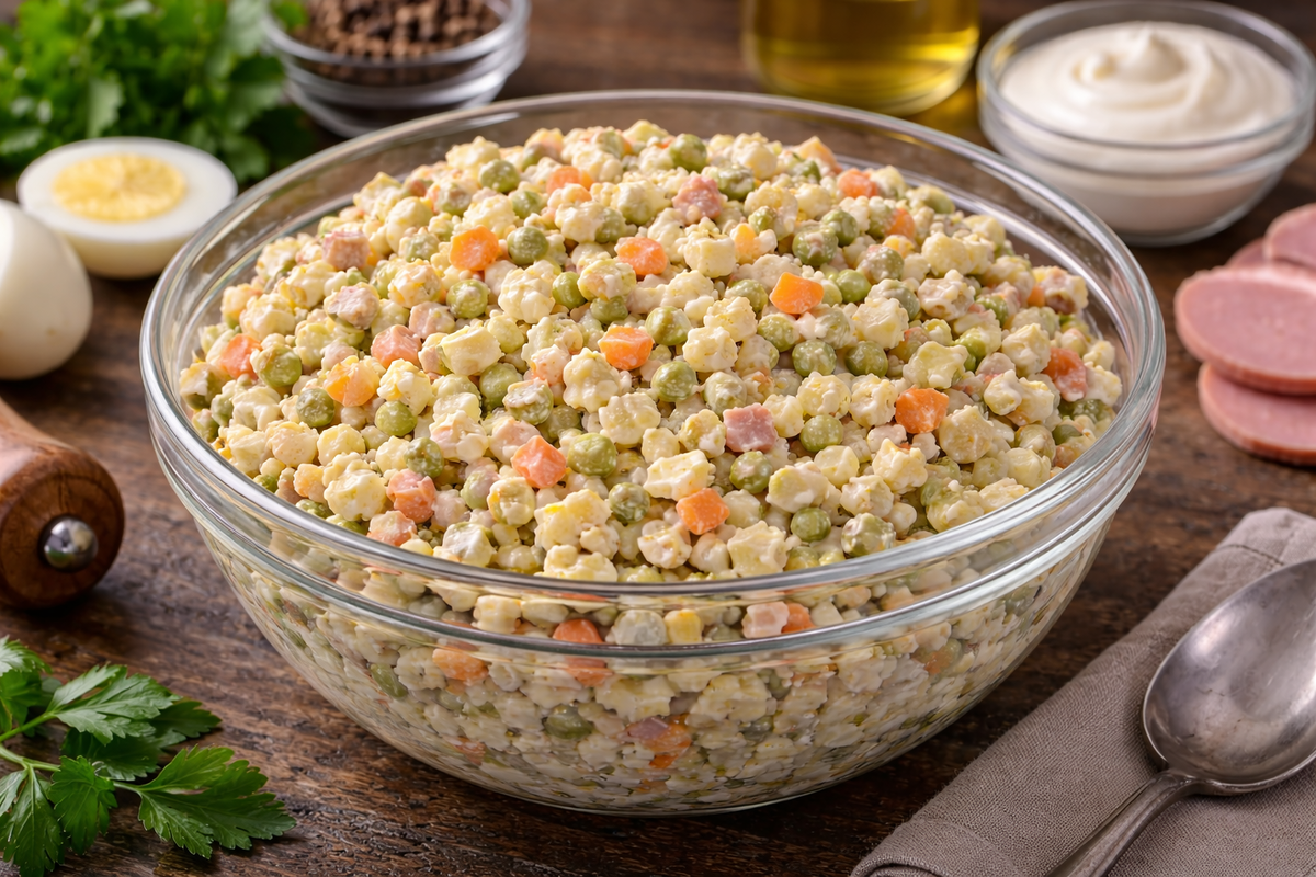 Есть у меня один проверенный способ приготовления оливье, к которому я возвращаюсь каждый праздник и просто когда хочется чего-то по-настоящему домашнего. Казалось бы — самый привычный салат, знакомый с детства, простые продукты, никаких изысков. Но стоит поставить его на стол, и кто-нибудь обязательно говорит: «Вот это настоящий оливье». И миска пустеет очень быстро. Оливье — тот самый салат, который создаёт ощущение уюта и семейного застолья. Никаких сложных соусов или редких ингредиентов. Всё отварили, аккуратно нарезали, перемешали — и уже через пару часов в холодильнике стоит салат, который пахнет праздником. Главное здесь — не переварить овощи и нарезать всё одинаковыми аккуратными кубиками. Тогда вкус получится гармоничным, а текстура — нежной и сбалансированной. В результате получается нежный, сбалансированный салат с мягкими овощами, сочной колбасой и лёгкой солёной ноткой огурцов. Он хорош и сразу после приготовления, и на следующий день — когда настоится ещё лучше. Из личног