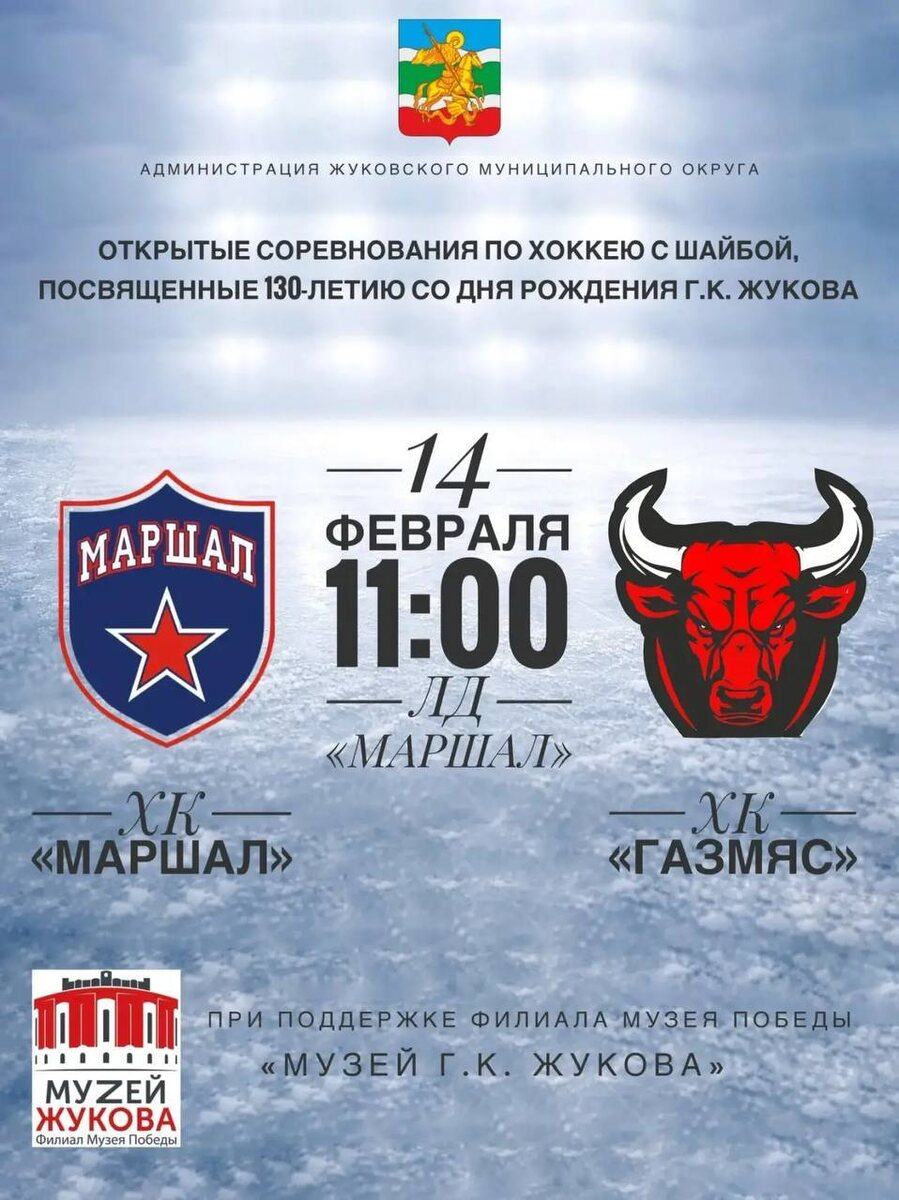 📌 14 февраля, ровно в 11:00, приглашаем вас на последнюю игру открытых соревнований по хоккею с шайбой, приуроченную к знаменательной дате — 130-летию со Дня Рождения Георгия Константиновича Жукова ✨ Матч пройдет в стенах Ледового Дворца «Маршал» и соберёт две сильные команды: ⚡️ХК «Маршал» против ХК «Газмяс». Будет горячо и зрелищно! 🏁 Присоединяйтесь к этому событию вместе с нами. Вас ждёт море эмоций, ярких моментов и незабываемого спортивного праздника! Вход абсолютно бесплатный 🤸♂️ "Спорт. Любовь к Родине. Поддерживаем такие инициативы. Они помогают приобщать земляков, нашу молодежь к активному образу жизни." - Губернатор Владислав Шапша. Встречаемся там, где спорт объединяет сердца! ✨ #Жуковскийокруг40