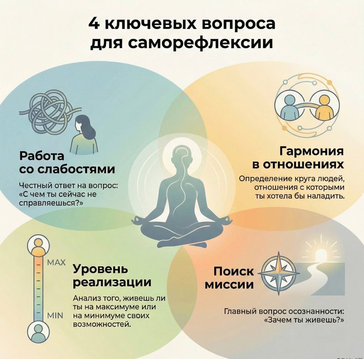 : 1️⃣ СТРАХИ/СЛАБОСТИ: С чем ты по твоему не справляешься? 2️⃣ ОТНОШЕНИЯ: Какие отношения ты хотела бы наладить? 3️⃣ ПРЕДСТАВЛЕНИЕ О СЕБЕ: Живешь на максимуме своих возможностей или на минимуме? 4️⃣ В ЧЁМ ТВОЯ МИССИЯ: Зачем ты живешь?