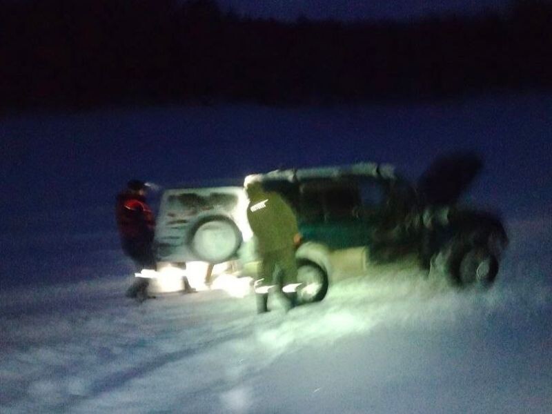 Накануне отчаянные парни решили провести испытания траков, для этого они прибыли на лёд в районе залива Жулгет. В итоге один трак провалился под лёд и утонул, второй трак застрял. Сами испытатели оказались в опасности. Спасатели Дивногорского поисково-спасательного отряда на аэролодке выехали на лёд водоёма и эвакуировали граждан. Фото: КГКУ "Спасатель"