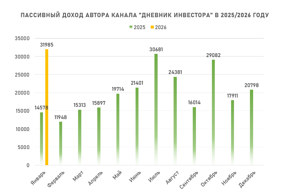 Сегодня расскажу, какой пассивный доход пришёл от инвестиций за очередной месяц. Также поделюсь источниками дохода. Веду эту рубрику уже более 2 лет на своем канале. Так удобнее отслеживать прогресс в этом деле. Так вот: ▪️ Пассивный доход за январь: +31 985 ₽ (в прошлом году было 14 578 ₽). На графике отобразил динамику дохода за 2025 и 2026 год. ▪️ Цель на 2026: 360 000 ₽ за год или 30 000 ₽ в месяц Мои источники пассивного дохода в январе: ▪️ Дивиденды – 10735 ₽