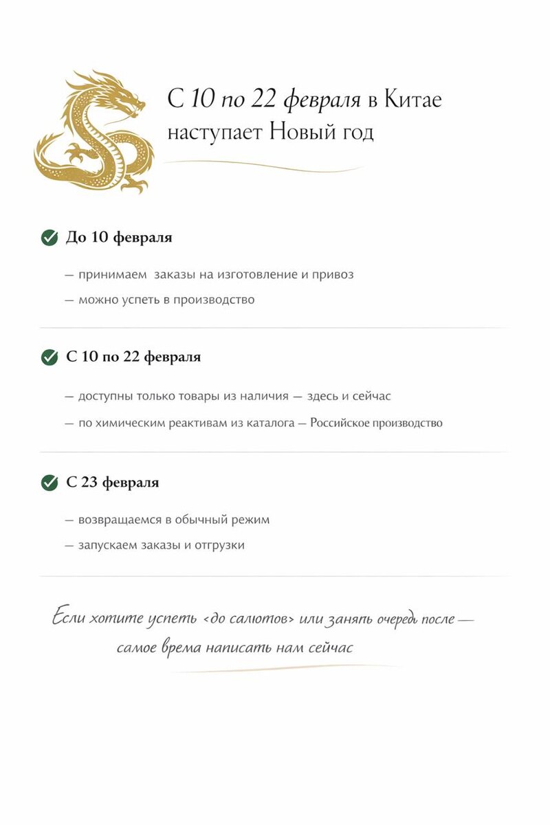 Фабрики отдыхают, логистика замедляется Как работаем мы: ✔️ До 10 февраля — принимаем заказы на изготовление и привоз — можно успеть в производство ✔️ С 10 по 22 февраля — доступны только товары из наличия — здесь и сейчас — по химическим реактивам из каталога — Российское производство ✔️ С 23 февраля — возвращаемся в обычный режим — запускаем заказы и отгрузки Если хотите успеть «до салютов» или занять очередь после — самое время написать нам сейчас
