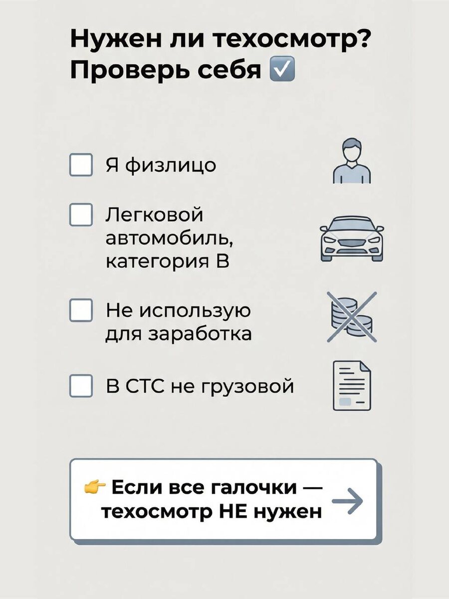 🚗 И снова о техосмотрах. Закон об отмене техосмотра для легковых авто физических лиц приняли ещё в 2021 году, но… 🤯 вопросы у моих клиентов возникают постоянно. Поэтому давайте ещё раз — чётко, по полочкам и без юридического тумана 👇 ❌ Когда техосмотр НЕ нужен Если у вас: ✔️ легковой автомобиль ✔️ вы — физическое лицо ✔️ авто не используется для коммерции 👉 техосмотр проходить не нужно ! 📌 Для ОСАГО техосмотр предъявлять тоже не требуется. ⚠️ Но !!! если автомобиль категории B, а в СТС в графе «Тип ТС» указано: — грузовой — грузовой фургон — и т.п. ➡️ такой автомобиль уже подпадает под обязательный техосмотр. ✅ Когда техосмотр ОБЯЗАТЕЛЕН 🚕 автомобиль используется в коммерческих перевозках 🚖 работает в такси 🔧 вы вносили изменения в конструкцию автомобиля 📝 вы купили автомобиль старше 4 лет (в этом году 2022 года и старше) и ставите его на учёт 🏢 автомобиль принадлежит юридическому лицу 🚛 все грузовые автомобили