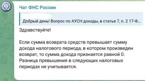засчитывается. Такие разъяснения дала ФНС. Пример: Плательщик на АУСН «доходы» вернул предоплату покупателю и уменьшил на эту сумму доходы того налогового периода, в котором произвел возврат. Сумма возврата превысила сумму доходов в соответствующем периоде. Можно ли зачесть разницу в следующем месяце? Ответ: Нельзя. Если сумма возвращенной предоплаты на АУСН превышает сумму дохода налогового периода, в котором произведен возврат, то сумма дохода будет равной нулю. При этом сумма превышения в следующих налоговых периодах не учитывается.