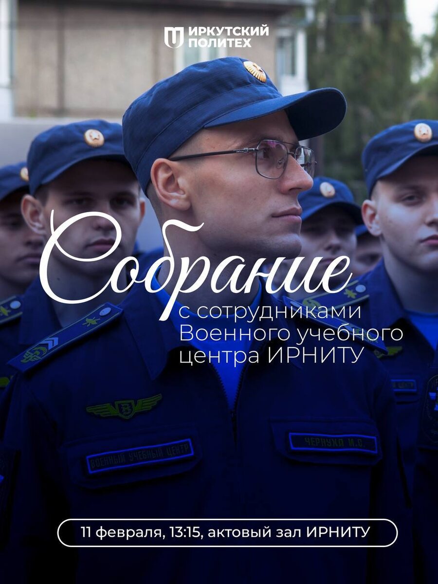 📌 Встреча с сотрудниками Военного учебного центра состоится 11 февраля в 13:15 в актовом зале ИРНИТУ. Здесь вы узнаете об условиях поступления и прохождении обучения в ВУЦ. 📌 Прием заявлений на конкурсный отбор пройдёт с 16 февраля по 21 марта в Военном учебном центре по адресу: — Иркутск, ул. Карла Либкнехта 153, кабинет 319 (3 этаж) — с 9:00 до 17:00 (пн-пт) При подаче заявления при себе необходимо иметь следующие документы: — Паспорт гражданина Российской Федерации — Приписное свидетельство из военкомата — Студенческий билет При написании заявления необходимо знать код и наименование направления подготовки в вузе. ❗После подачи заявления необходимо заказать справку о наличии (отсутствии) судимости через сайт www.mfc38.ru ☎ По вопросам поступления в Военный учебный центр: 40-58-95, 40-58-94 Подробнее о ВУЦ: vk.cc/cTP1Oa 👻 МАХ | 💙 ВК | 📝 ДЗЕН