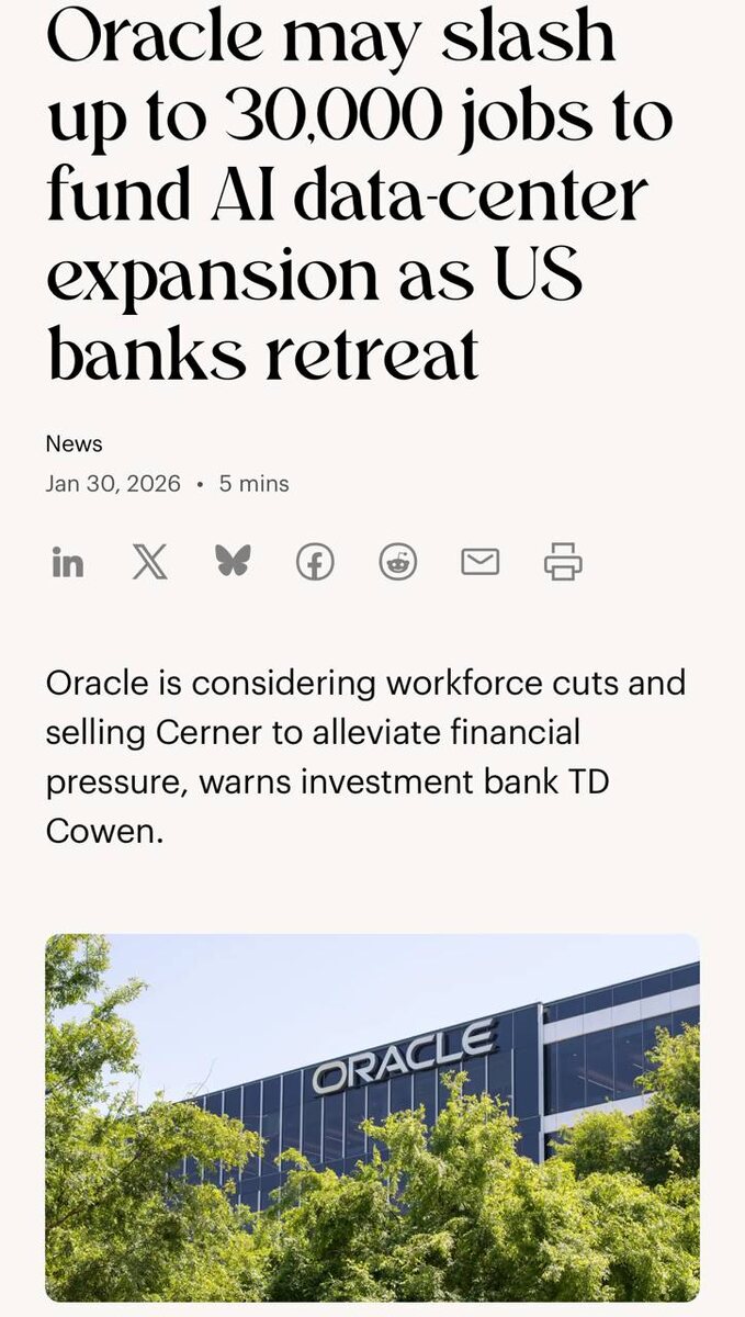 ? Крупная компания Oracle собирается уволить до 30 тысяч человек, чтобы профинансировать строительство дата-центров для искусственного интеллекта. Бум ИИ принес им огромные доходы, но банки теперь опасаются рисков и не дают займы. Приходится экономить на штате, чтобы развивать новые мощности. 🤖📝 ИИ процветает, а люди на выход — типичный сюжет, где роботы берут верх без лишних церемоний. 🌐Сайт 💬Телеграм канал 📰Яндекс Дзен 📺YouTube #Aimatic #ИИвБизнесе #Автоматизация