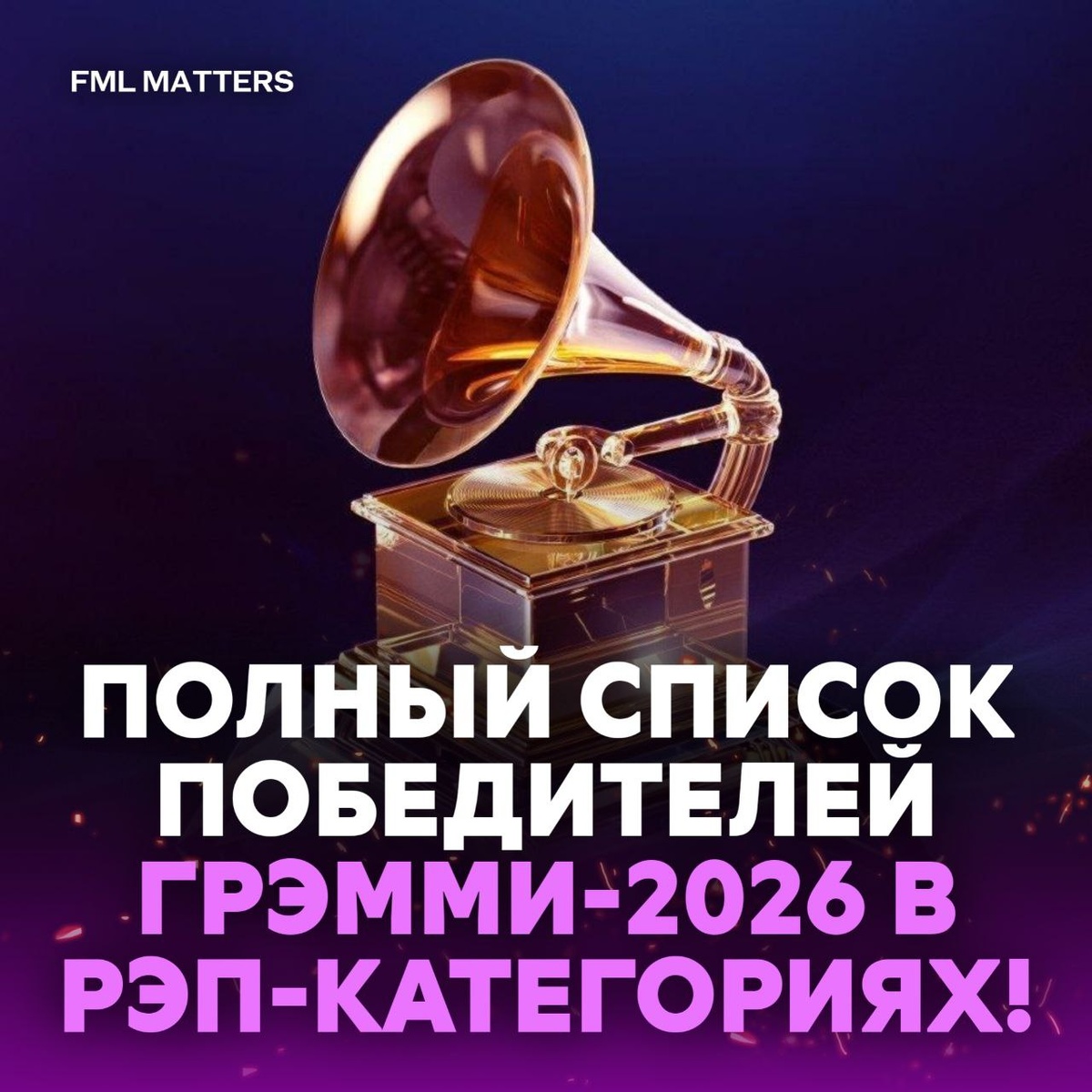 ! Ниже представлены все победители и номинанты исключительно в рэп-номинациях 68-й церемонии Грэмми. 🎤 ЛУЧШИЙ РЭП-АЛЬБОМ · 🏆 Kendrick Lamar – «GNX» (ПОБЕДИТЕЛЬ) · Clipse – «Let God Sort Em Out» · GloRilla – «Glorious» · JID – «God Does Like Ugly» · Tyler, The Creator – «CHROMAKOPIA» 🎵 ЛУЧШАЯ РЭП-ПЕСНЯ · 🏆 Kendrick Lamar feat. Lefty Gunplay – «TV Off» (ПОБЕДИТЕЛЬ) · Clipse feat. John Legend & Voices of Fire – «The Birds Don’t Sing» · Doechii – «Anxiety» · GloRilla – «TGIF» · Tyler, The Creator feat. GloRilla, Sexyy Red & Lil Wayne – «Sticky» 🎷 ЛУЧШЕЕ РЭП-ИСПОЛНЕНИЕ · 🏆 Clipse feat. Kendrick Lamar – «Chains & Whips» (ПОБЕДИТЕЛЬ) · Cardi B – «Outside» · Doechii – «Anxiety» · Kendrick Lamar feat. Lefty Gunplay – «TV Off» · Tyler, The Creator feat. Teezo Touchdown – «Darling, I» 🎶 ЛУЧШЕЕ МЕЛОДИЧНОЕ РЭП-ИСПОЛНЕНИЕ · 🏆 Kendrick Lamar & SZA – «luther» (ПОБЕДИТЕЛЬ) · Fridayy & Meek Mill – «Proud of Me» · JID feat. Ty Dolla $ign & 6lack – «Wholeheartedly» · PartyNextDoor & Drake