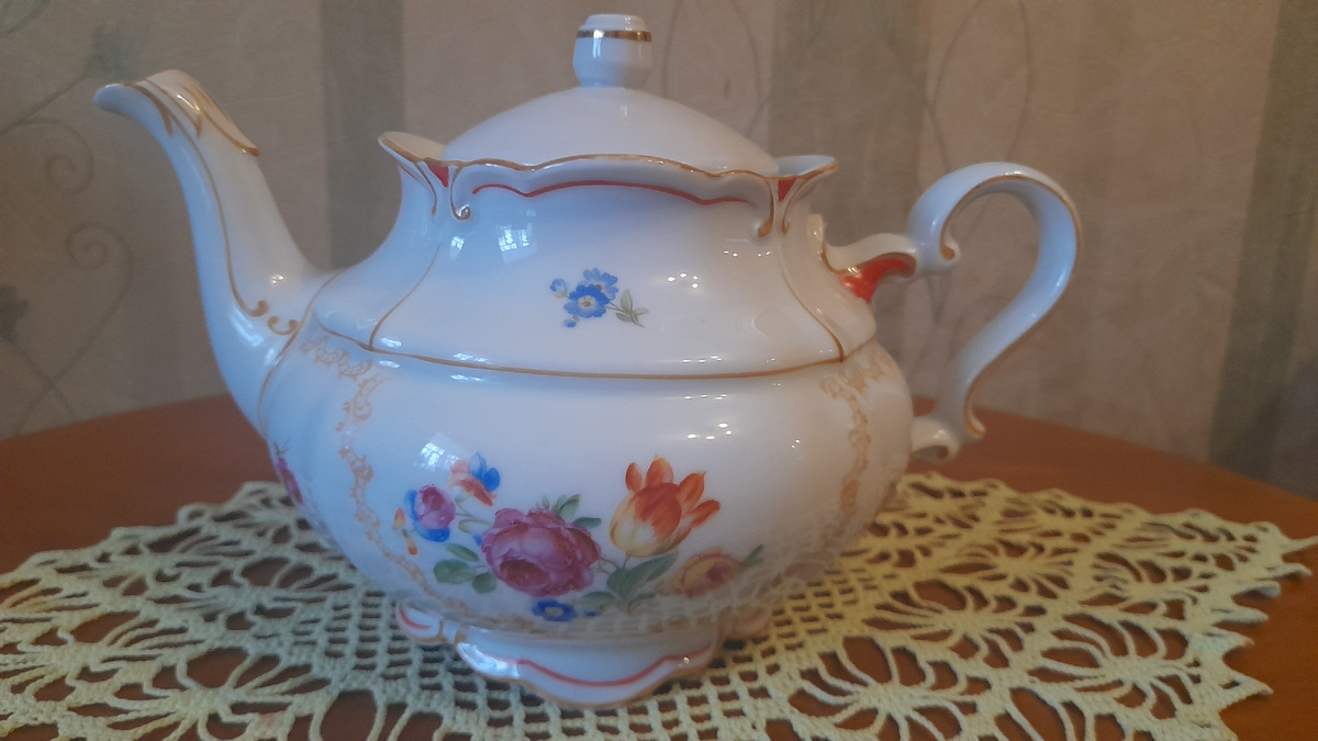 Этого красавца я вам уже вскользь показывала в некоторых прежних публикациях. А здесь хочу рассказать о нём одном отдельно, он того заслуживает. Его отдала мне ближайшая подруга, моя бывшая коллега, когда я начала собирать винтажный советский и российский фарфор. И хотя он не относился к этой категории, но не отказываться же от такой красоты. Этот чайник перешёл к ней из семьи её бывшего мужа. Её сын и внуки давно живут в Израиле, вернее, внуки и родились там, ей он тоже не нужен. Узнать о его происхождении уже не у кого. Он весь в прекрасном состоянии, только крышка у него не родная (у меня, вообще, скоро будет целая коллекция чайников без крышек или с неродными крышками, а что очень своеобразная коллекция). Кстати, он был, можно сказать, основателем моего собрания чайников, которые я, вообще-то, и не думала собирать. Принесла его и, конечно, первым делом стала изучать его клеймо. Оказалось, что это клеймо немецкой фабрики фарфора Jlmenau (Ильменау) Graf von Henneberg, ставилось с 1