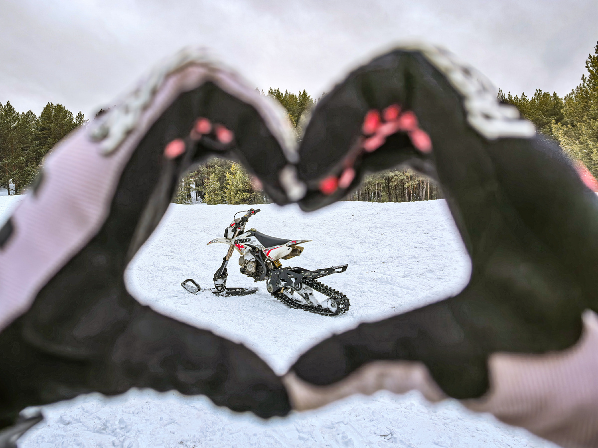 Для укатанных трасс и малого снега: используются узкие гусеницы (около 20 см) с низким зацепом 20–30 мм и узкие лыжи. Такой комплект делает мотоцикл максимально юрким и послушным, сохраняя повадки обычного «летнего» байка на твердом покрытии. Такие комплекты подходят для катания в окрестностях Екатеринбурга для малоснежной зимы.