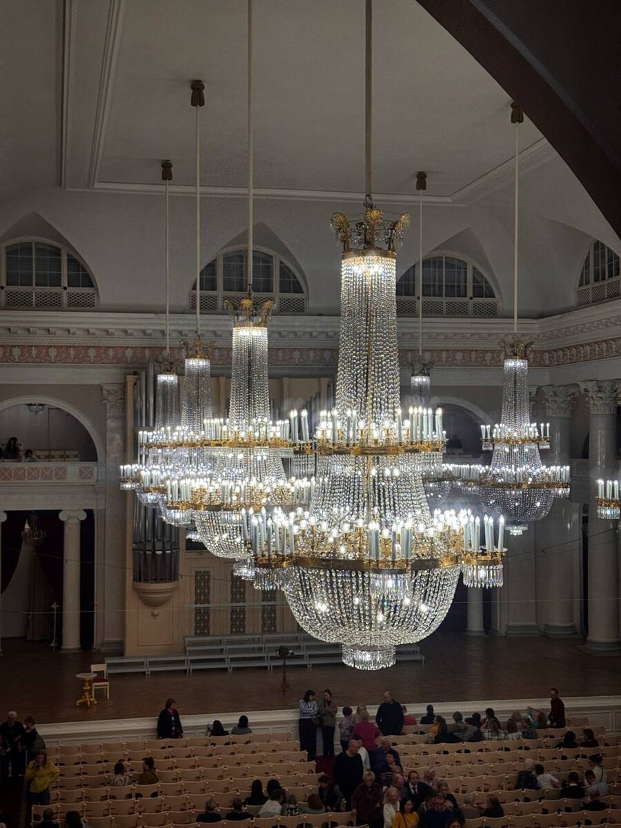 Шостаковича. Оба раза была не на музыкальном концерте 😆 В этот раз ходила 27 января на мероприятие, посвященное прорыву Блокады Ленинграда! (Последний пост на эту тему в ближайшее время) Был хор, читали стихи. Очень трогательное мероприятие! Но говорить будем о музыке. Хор был а капелла (спасибо маме, подсказала, как это называется). Репертуар был не грустный, пели восхитительно. Честно, я и не знала, что человеческие голоса умеют издавать звуки столь похожие на музыкальные инструменты. Отдельно хочется отметить акустику зала. Звук в нём буквально растекается. Вроде бы ничего особенного в конструкции зала на первый взгляд нет, но инженерная мысль творит чудеса. Музыка, как коньяк, который отдает аромат в правильном бокале, раскрывается всю полноту в правильном зале. И, конечно, нельзя пройти мимо шикарных люстр. Они создают невероятное торжественное настроение! В общем рекомендую всем ходить в филармонию: там недорогие билеты, два десятка мероприятий в месяц и наполняешься прек