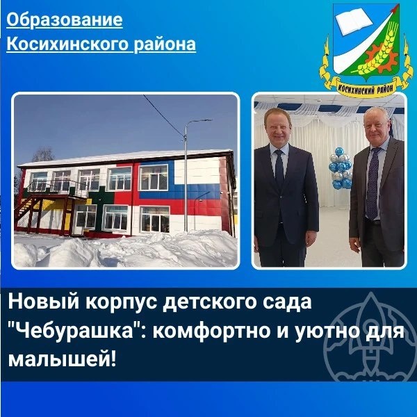 😍Корпус 5 детского сада №3 «Чебурашка» в селе Косиха вновь распахнул двери после завершения капитального ремонта.🔹Торжественное открытие состоялось при участии высокопоставленных лиц: Губернатора Алтайского края Виктора Томенко, заместителя Председателя Правительства Юрия Абдуллаева, замминистра образования Ларисы Терновой, депутата АКЗС Александра Траутвейна, председателя РСНД Анатолия Иванова и представителей образовательного сообщества.🔹 Особую благодарность высказали руководству подрядчика, которое ответственно подошло к реконструкции учреждения.👫Теперь дети имеют современный интерьер, игровую площадку и просторные игровые комнаты, обеспечивающие комфортные условия для полноценного детства.🔹Глава района Константин Татарников выразил слова благодарности Правительству края и лично Губернатору Виктору Томенко ... Ссылка на публикацию #Косихинскийрайон