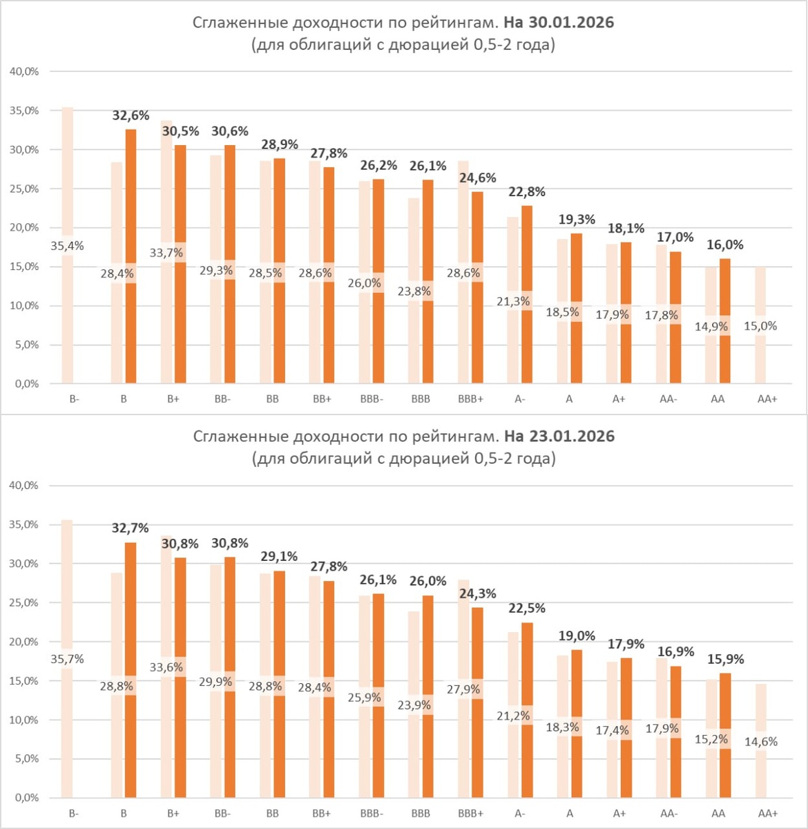 Средние доходности облигаций в зависимости от рейтинга (бледные столбцы — доходности без сглаживания). И как они изменились за неделю. Телеграм: @AndreyHohrin Не является инвестиционной рекомендацией. Ссылка на ограничение ответственности Следите за нашими новостями в удобном формате: Telegram, Youtube, RuTube, Smart-lab, ВКонтакте, Сайт