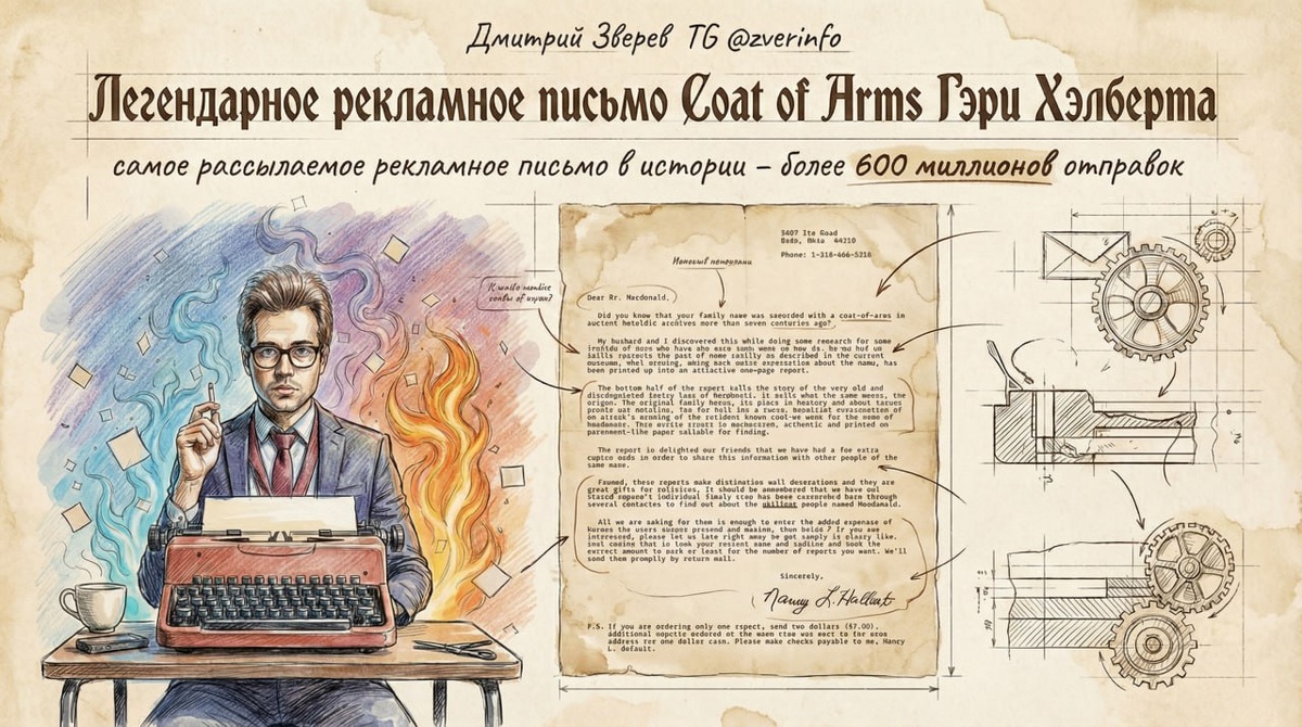 1970-80 годы - время классического директ-маркетинга с отправкой рекламных сообщений по почте. И есть очень интересные примеры маркетинговых кампаний, которые приносили огромную прибыль. Рассмотрим один из самых известных - "Письмо про герб Хэлберта". Оно приносило до 300 000 долларов в день выручки в 1970 годы. Суть: в письме было предложение купить герб (coat of arms) своей семьи за $2 (его можно было повесить на стену как картину). Причем - текст был персонализирован по фамилии получателя. Условно - Джонсоны получали бы письмо про Джонсонов, а Смиты про Смитов 😁 Письмо начиналось с интригующего вопроса: "Знаете ли вы, что ваша фамилия записана с гербом в геральдических архивах более семи веков назад?". Оно личное сообщение от "Nancy L. Halbert", рассказывая историю "исследований" для друзей, и предлагало красивый рисунок герба с историей фамилии Ниже привожу текст письма (это пример для фамилии Macdonald) —- Знаете ли вы, что ваша фамилия была записана с гербом в древних геральдиче
