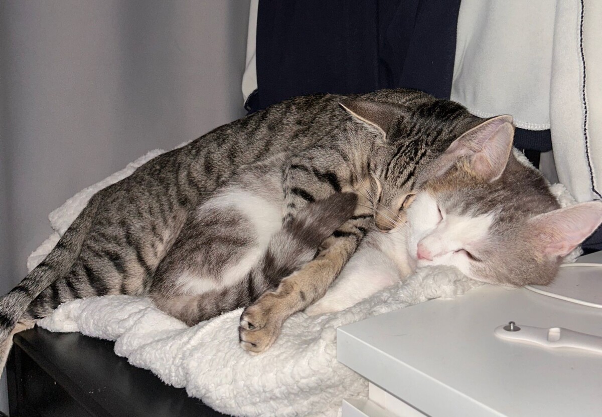 В нашем доме живут два кота. Первого маленьким на улице подобрали, второго двухмесячного ориентала нам отдали, когда старшему было полтора года. Старший Михаил младшего принял, у него характер хороший, ласковый, спокойный. Младший пришёл с красивым именем Юпитер, но у нас быстро превратился в Петьку. Петька полюбил Мишу всей своей ориентальской душой, нет для него больше радости, чем поесть и к Мишкиной спинке прижаться. Он пять минут без Мишки обойтись не может.