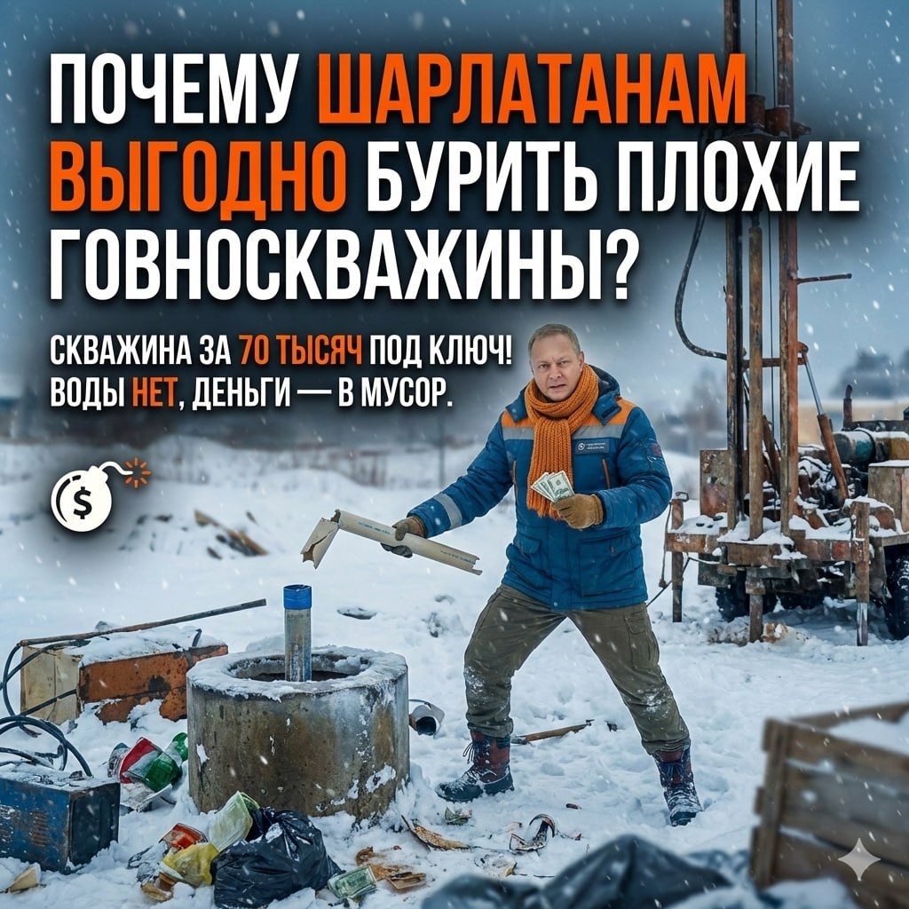 ? 🚨 Вам предлагают «За 80 тысяч пробурим скважину и проведем воду в дом под ключ!». Ваш мозг кричит «Дешево, дайте две». Через год: воды нет, буровик в тумане, на участке дыра в земле с мутной водой, деньги — в мусор. Это не "карма" и не "не повезло с геологией". В Свердловской области шабашникам выгодно бурить плохие скважины. И пока вы верите в "дешево и быстро" — вы их идеальный клиент. 💸 ________________________________________ 💣 Почему им выгодно делать плохо? 1️⃣ Заработок на скорости, а не на качестве Нормальная скважина с трубой по ГОСТ, цементацией и паспортом — это время и материалы, вложения в рекламу и в продвижение качественных услуг. Это долго и довольно дорого! Шабашник из компании ""БуримЗаНедорого" предложил низкую цену, вы быстро согласились, выгодно же. Он быстро заехал, пробурил "дыру", воткнул дешёвую трубу — и уже едет к следующему. Чем больше дырок в неделю, тем больше денег. Убеждать никого не нужно. Низкая цена продает себя сама. 2️⃣ Вы всё равно не прове