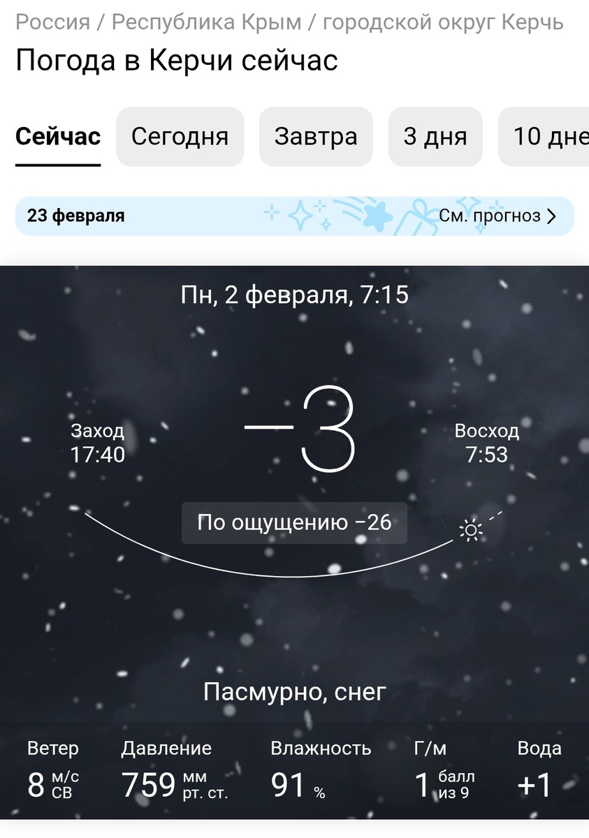 Правда, пригождается она один раз в 3 года. Достанешь родименькую шубочку из самых дальних углов шкафа, встряхнешь, нарядишься в нее, и аки Снежная Королева ходишь в ней целую неделю. Это если повезет. Но чаще всего "шубная" зима у нас длиться три дня. Вот вам сегодняшняя наша погода: Что такое - 3 на термометре? Тьфу, а не похолодание, скажете вы. Но наши керченские -3 градуса ощущаются ка полноценные - 26! Всё благодаря северо-западному ветру, который, такое ощущение, дует к нам прямо с Северного полюса. Ну, в -26 вроде как самое время доставать шубу? А вот и нет! Ведь у нас прямо сейчас не погода, а сказка: на градуснике - 3, на щеках чувствуется все - 26. А с неба падает дождь, который еще в полете застывает в крошечный град! Все вокруг мокрое и серое, а еще стало невероятно скользко - каток на дорогах, на тротуарах! Красота! Я пока дотопала до работы - весь мой пуховик покрылся тонким слоем льда. Я стала похожа на стеклянную елочную игрушку ))) Так что шуба опять отменяется. Пока