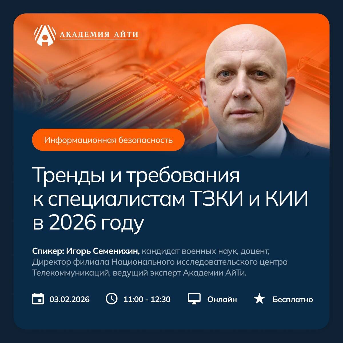 В предыдущих материалах мы говорили о том, что в 2026 году требования к ТЗКИ и обеспечению безопасности КИИ всё чаще оцениваются не формально, а через корректность реализации и уровень подготовки специалистов. Именно этому и посвящён вебинар, который пройдёт завтра - 3 февраля. На вебинаре разберём: ➡️ какие изменения в требованиях и нормативных документах важно учитывать уже сейчас; ➡️ как эти требования «приземляются» в реальных системах и процессах; ➡️ какие знания и навыки ожидаются от специалистов ТЗКИ и КИИ в 2026 году; ➡️ почему поддержание компетенций становится ключевым фактором соответствия. 🎙 Спикер: Игорь Семенихин — к.воен.н., доцент, директор филиала НИЦ телекоммуникаций, ведущий эксперт Академии АйТи. Вебинар будет полезен тем, кто: ✔️отвечает за ТЗКИ и безопасность КИИ; ✔️участвует в реализации мер защиты информации; ✔️хочет понимать требования не только «по документам», но и на уровне практики. 📅 3 февраля в 11:00 мск 👉 Регистрация на вебинар — по ссылке ht