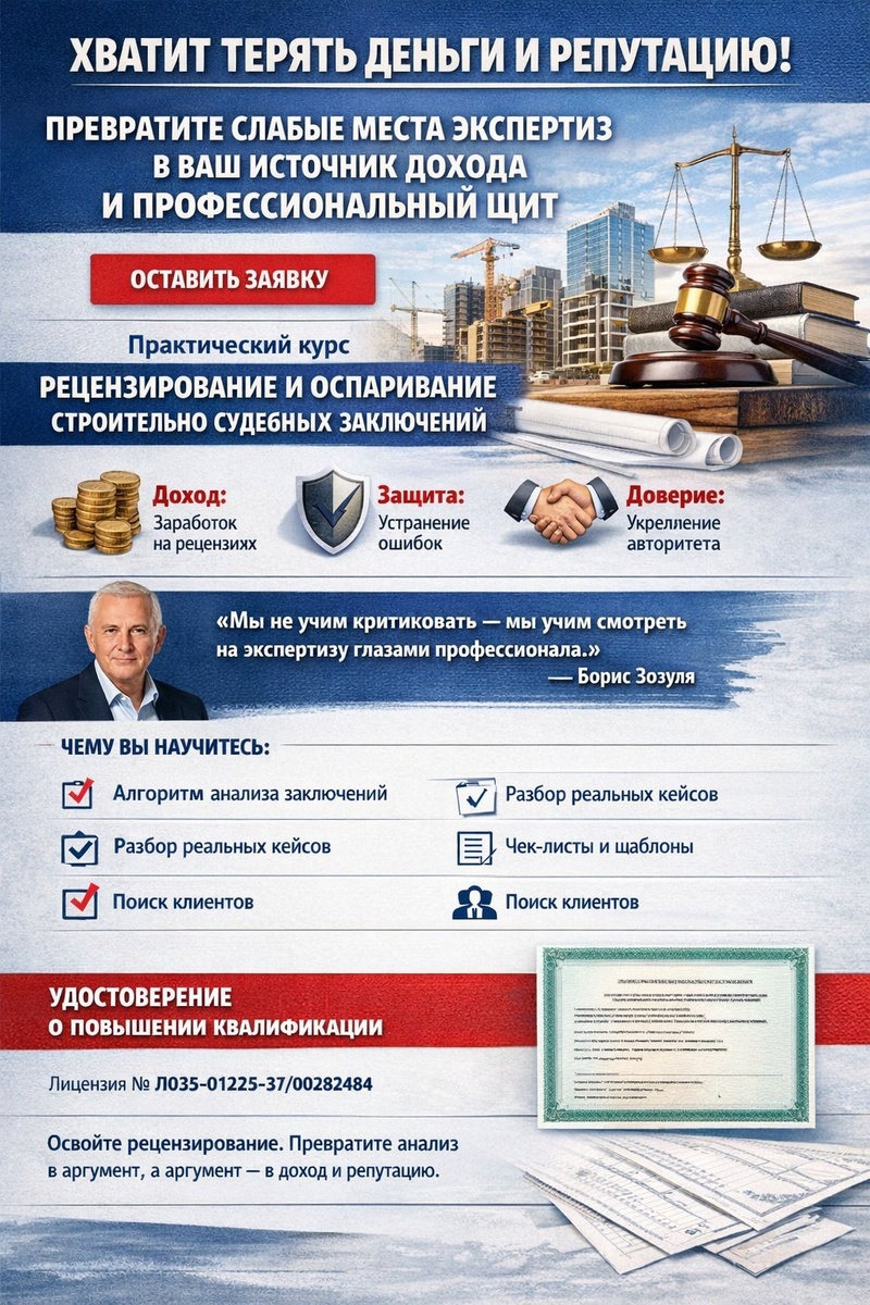 🗣Хватит терять деньги и репутацию. Превратите слабые места экспертиз в ваш источник дохода и профессиональный щит. Оставить заявку Если вы эксперт, вы знаете: одна методическая ошибка — и ваше заключение, ваши время и репутация поставлены под удар. В судебных и досудебных спорах на кону не только мнение, но и доверие заказчиков, судов и коллег. Рецензирование — это не придирки. Это мощный инструмент для: Представляем практический курс: "Рецензирование и оспаривание строительно судебных заключений" Методика, проверенная практикой. «Мы не учим критиковать — мы учим смотреть на экспертное заключение глазами профессионала.» — Борис Зозуля, преподаватель курса. Чему вы научитесь: После курса вы сможете: «Я не учу критиковать. Я учу видеть документ так, как его видят те, кто принимает решения.» — Борис Зозуля Инвестируйте в главный навык эксперта — профессиональную проницательность. По окончании курса вы получите удостоверение о повышении квалификации. *Лицензия на осуществление образ