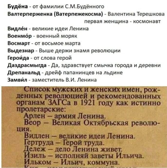 ! Самые необычные имена, которые давали советским детям. Лориэрик — это сокращение от Ленин, Октябрьская революция, индустриализация, электрификация, радиофикация и коммунизм. Мне действительно жаль бедного Лориэрика. Лунио — означает «Ленин умер, но идеи остались». Еще один пример — Орлетос. В этом сокращении заложено «Октябрьская революция, Ленин, труд – основа социализма». А вот совсем странное имя: Даздасмыгды — расшифровывается как «Да здравствует смычка города и деревни». Подписаться: https://dzen.ru/id/689639a4eb96fd517437fe69 Новости и фото отправляйте в чат-бот: @Rezh_best_news_bot