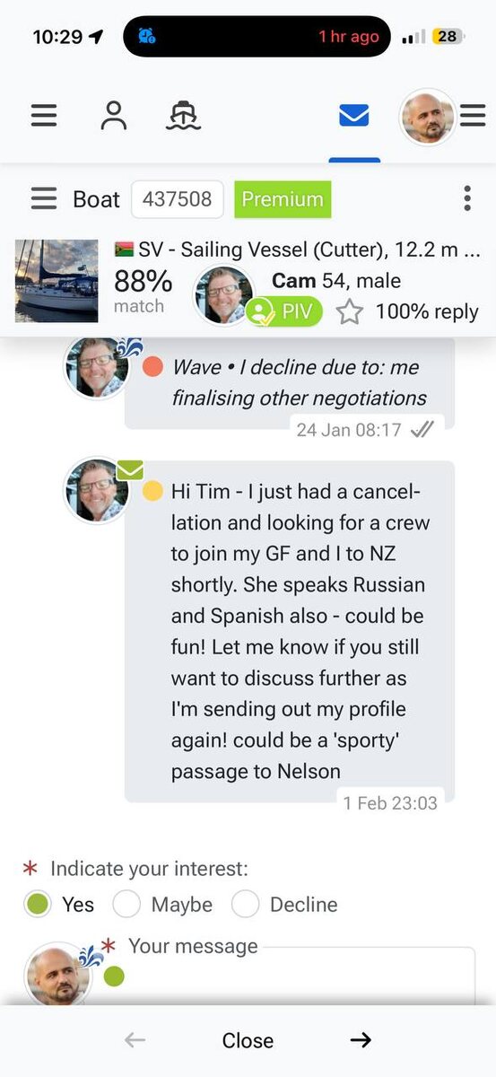 Утром, проснувшись, я увидел вот такое сообщение на сайте поиска яхт findacrew