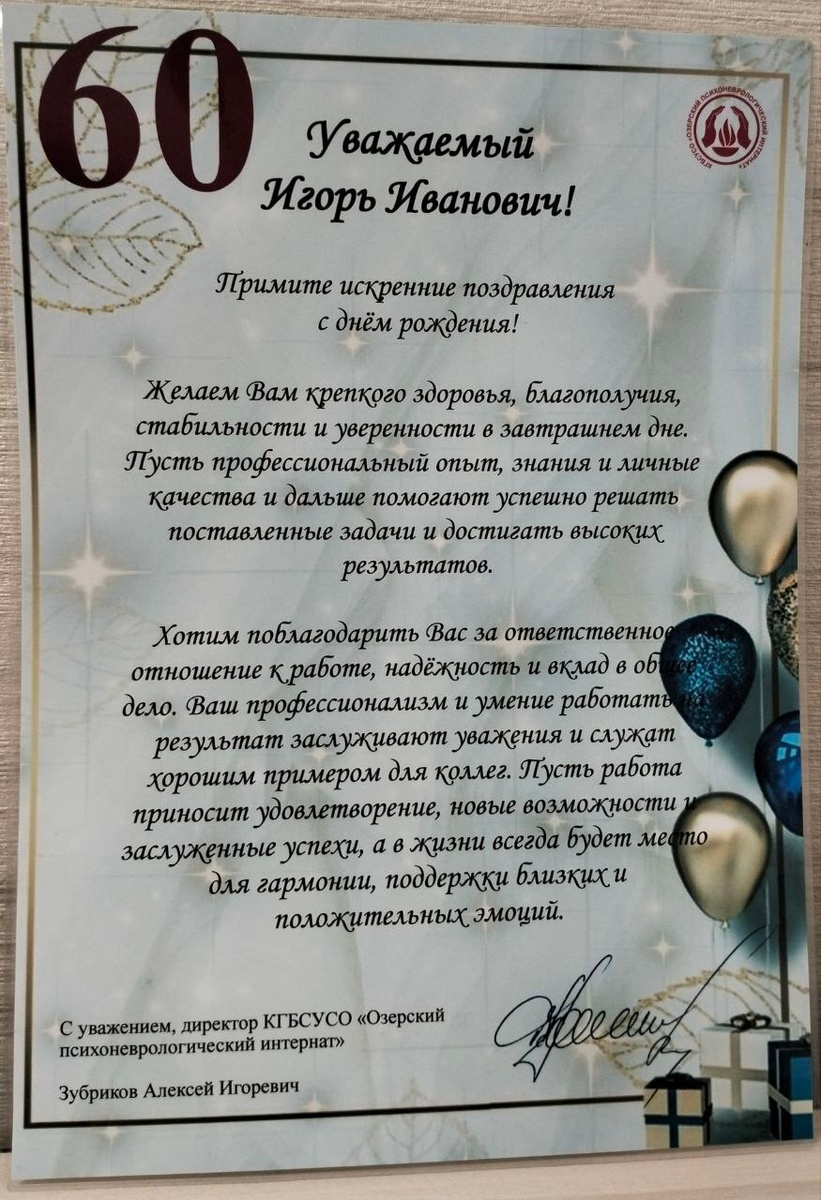 ! 👨🔧Игорь Иванович — человек с золотыми руками и большим сердцем, который каждый день вкладывает свою душу в дело, обеспечивая всем нам тепло и комфорт. Его труд и преданность делу не остаются незамеченными, и мы очень ценим его вклад в нашу работу. 🤝Желаем вам, Игорь Иванович, крепкого здоровья, счастья и благополучия! Пусть каждый день приносит радость, а все начинания завершаются успехом. Спасибо за вашу самоотверженность и трудолюбие! #ОзерскийПНИ #Юбилей