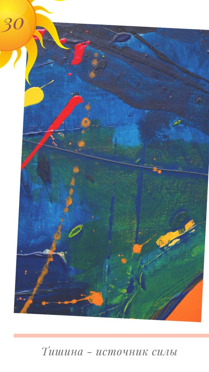 🌿 Сегодня у нас — карта недели. Посмотрите на неё. Как вы её прочитаете? Что первым коснется внутри — синева, брызги цвета, цифра или тихая фраза внизу? 💫 Тишина вокруг — это не пустота. Это пространство, которое дышит глубже, чем мы говорим. Лес, озеро, комната, где никто не ждет ответа. Тишина внутри — не отсутствие мыслей. Это красные и желтые брызги на синем полотне: энергия, которая не кричит, а ждет, чтобы стать цветом. Тишина как ответ — когда перестаешь искать слова и слышишь: «Достаточно просто быть». Не нужно заполнять паузы. Иногда мудрость в том, чтобы ничего не добавлять. Тишина без напряжения — это когда не думаешь «надо отдохнуть». Когда не следишь за часами. Ты просто есть — как солнце с цифрой 30: не в ожидании, а в своем времени. Тишина спокойствия — не когда «все хорошо», а когда «все есть». Даже если «есть» — усталость. Даже если «есть» — туман. Тишина — не бегство. Это возвращение в себя. Источник силы — не в громких решениях. А в том, чтобы услышать, как ды