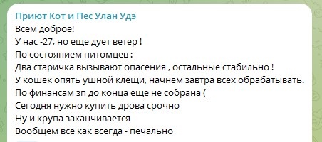 Здравствуйте, дорогие друзья! Начался последний месяц зимы. Мы уже мечтаем о теплых солнечных деньках, но впереди нас еще ждут морозы, стужа и снегопады. А сегодня действительность такова, что нет дров, не выплачена зарплата и заканчивается крупа. Приюту без вашей помощи не выжить. На вольеры нам осталось собрать 20 550 рублей. Сроки для расчета по этому долгу истекли, но мы не успели расплатиться вовремя. В выходные дни сострадательные жители Бурятии привозили в приют подарки. Воскресные подарки вы вчера видели, а в субботу нам привезли "Шарики". У нас на эту неделю будут вкусные добавки в кашу. Вот только кашу варить уже практически не из чего и не на чем. Задача у нас очень не простая. Но мы верим, что вы и в этот раз поможете нам выбраться из ямы, в которую мы снова угодили. Принимаем от Вас посылки: