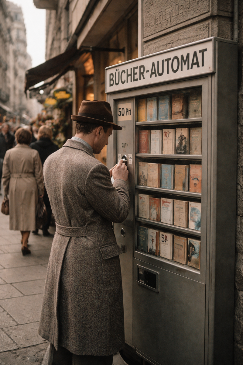 В первой половине XX века книга в Германии не воспринималась как событие. Её покупали так же буднично, как газету или билет. Именно из этой логики выросли книжные автоматы — уличные устройства, продававшие тонкие издания, брошюры, рассказы. Они ставились на вокзалах, у почт, возле фабрик и университетов. Книга выходила из пространства тишины и попадала в поток. Читать предполагалось между делами.