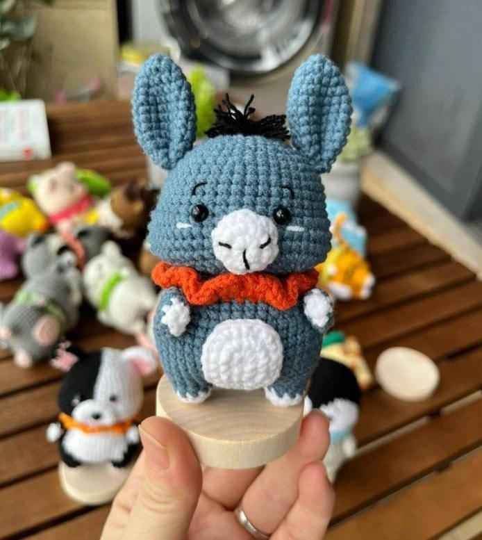 Оставить нить для пришивания. Вставить глаза в 12-13 ряду, расстояние 6сбн. Пришить мордочку, уши, вышить брови. Сделать волосы