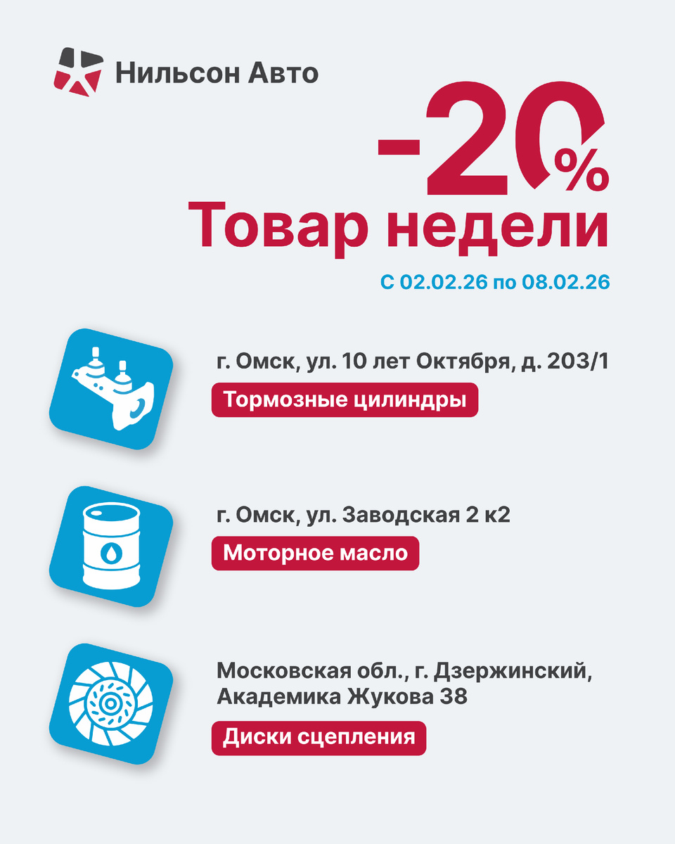 ТОВАР НЕДЕЛИ запускается в филиале Заводская, а также продолжает действовать весь февраль в остальных магазинах Нильсон Авто! Группы товаров с 02.02.26 по 08.02.26 👇🏻 📌 г. Омск, ул. 10 лет Октября, д. 203/1