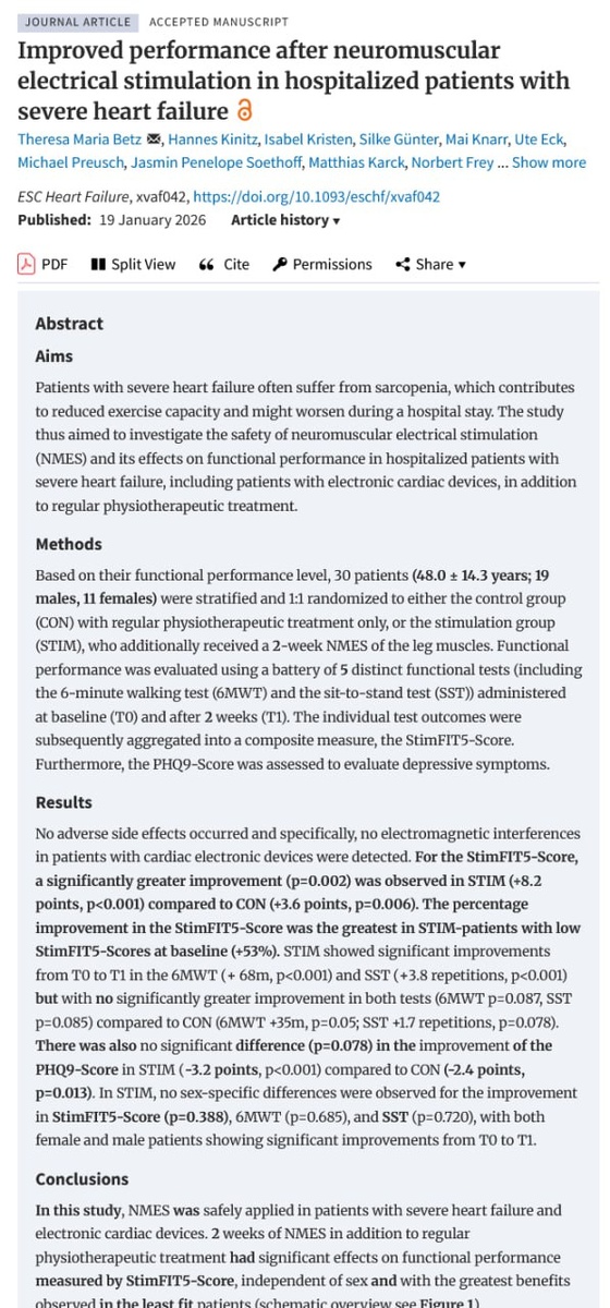 ⚡️🫀 Когда мышцы можно «включить», даже если сердце тяжёлое: новая реабилитация при тяжёлой сердечной недостаточности Пациенты с тяжёлой сердечной недостаточностью в стационаре — это особая категория. Они не просто устают. Они очень быстро теряют мышцы, буквально за дни. А без мышц нет движения, нет самостоятельности и нет восстановления — даже если сердце удалось стабилизировать. И вот здесь появляется технология, которая всё больше подтверждается наукой 👇 🔌 Что это вообще такое — нейромышечная электростимуляция? Нейромышечная электростимуляция (NMES) — это метод, при котором мышцы сокращаются не по команде мозга, а за счёт мягких электрических импульсов через электроды на коже. 👉 Проще говоря: мышцы работают — даже если человек слишком слаб, чтобы тренироваться сам. Этот метод давно используют в реабилитации после травм и инсультов. Но у пациентов с тяжёлой сердечной недостаточностью его долго считали «опасным» — особенно если есть кардиостимулятор, дефибриллятор или даже устройс