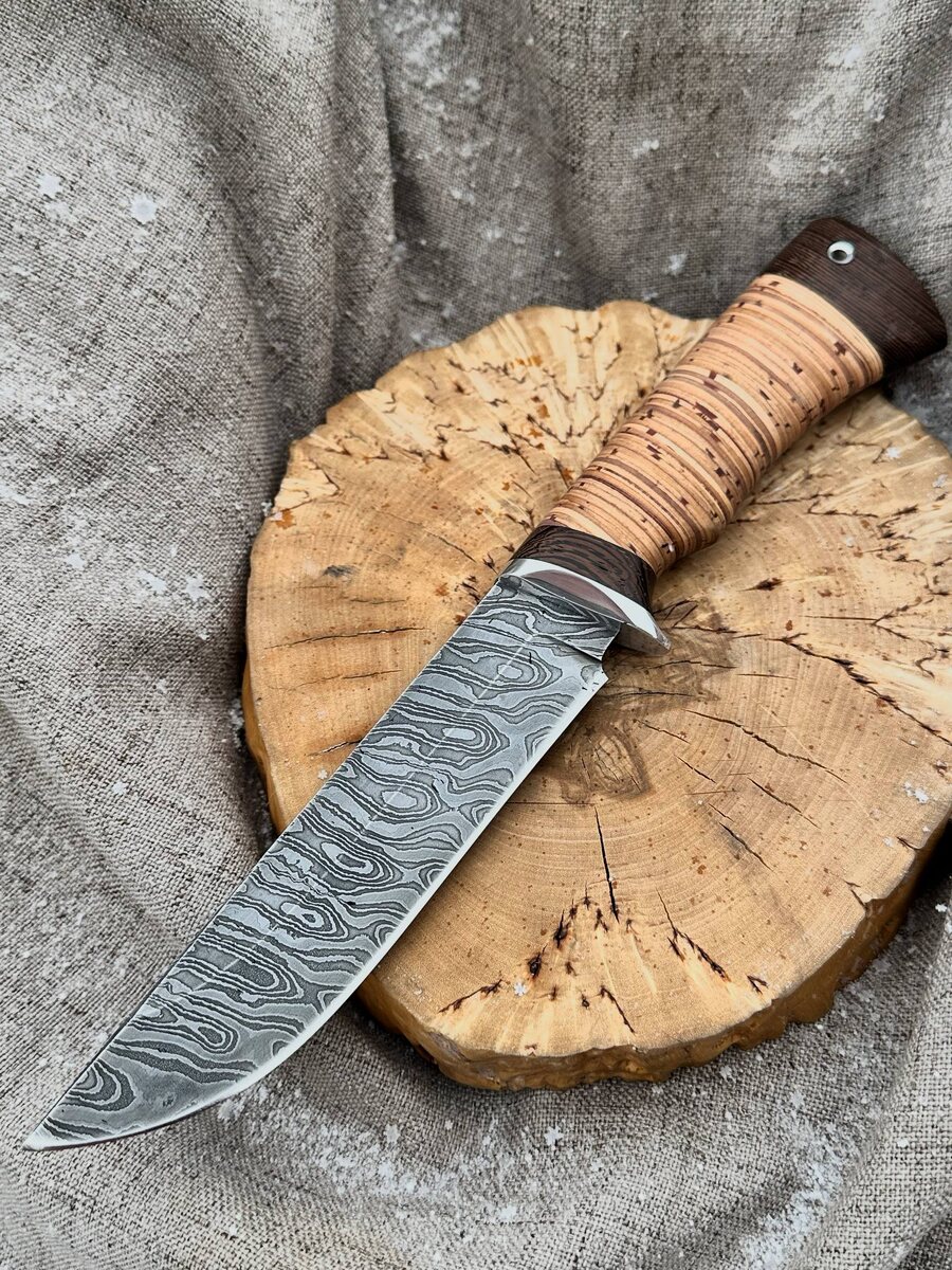 ! 950 слоёв дамаска — это не только красота уникального узора, но и *долговечная острота*: сталь долго держит заточку и обеспечивает агрессивный рез. Твердость клинка: HRC 62 — отличный баланс между прочностью и легкостью заточки. Рукоять — наборная из черного граба и бересты, с анатомической пяткой для удобного хвата даже в перчатках. Каждый нож заточен вручную до состояния бритвы. 🟤 В комплекте — ножны из натуральной кожи. *По желанию изготовим формованные ножны* (+8000 ₽). Цена: ~11.264 ₽~ → 9.574 ₽ по акции! 📲 Для заказа пишите: Telegram: [@Nazarklinokbot](https://t.me/Nazarklinokbot) WhatsApp/Viber: [ +7 910 134-38-31](https://wa.me/79101343831) #кузницаназарова #ножовод #дамасскаясталь #ручнаяработа #охота #подарокмужчине #ножикупить #назаров #туризм #сделановороссии