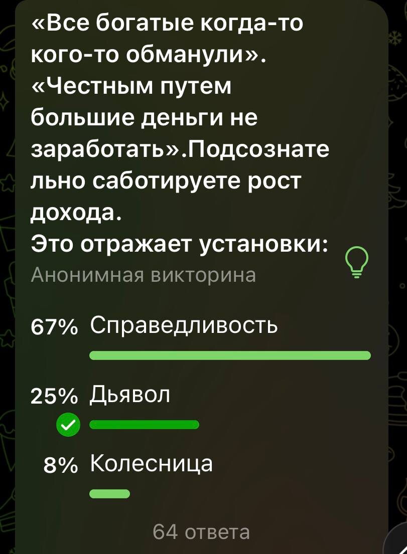 Помните этот вопрос в викторине? «Все богатые когда-то кого-то обманули. Честным путем большие деньги не заработать». Подсознательно саботируете рост дохода. Это отражает установки? 67% участников ответили: «Справедливость». Правильный ответ: «Дьявол». Почему рука потянулась к «Справедливости»? Предполагаю, потому что в установке звучат слова «обманули» и «честный путь». А это о моральной оценке. Мозг считывает их и выдает быструю ассоциацию: «Критикуют нечестность → значит, за правду → значит, это Справедливость». Уловка в том, что мы среагировали на отдельные слова, а не на смысл целого. Если обратить внимание на: 1⃣ Во-первых, на абсолютное обобщение: «Все богатые...» Это не «некоторые» или «многие». Это — «все». Такая формулировка не оставляет места для исключений, фактов или анализа. Создается образ тотальной порочности. 2⃣ Во-вторых, на безальтернативный приговор: «...не заработать» Это не про «сложно», не про «рискованно» и не про «редко». Это категоричное «нельзя». Установка
