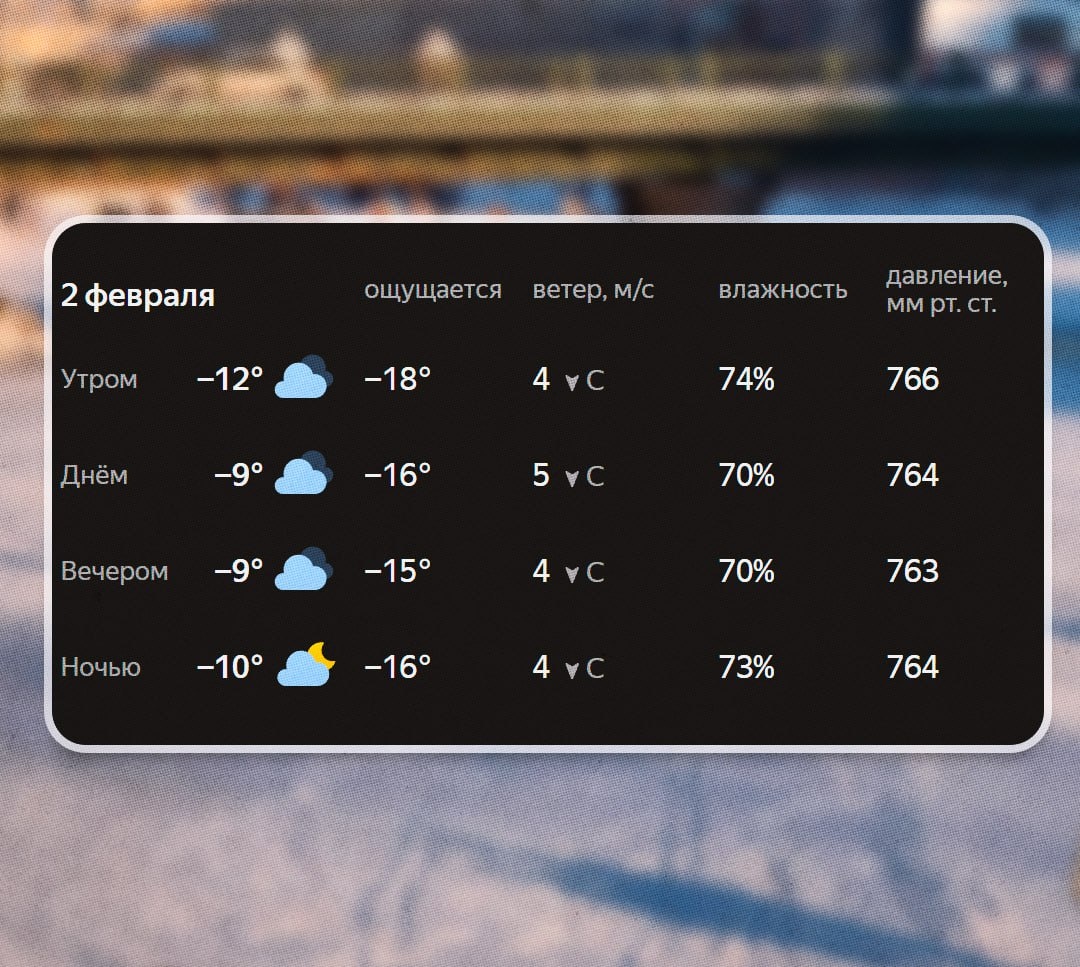 ! 2 февраля в городе ожидается пасмурная и морозная погода: утром −12°, днём и вечером около −9°, ночью — −10° с прояснениями. Ветер слабый, 4–5 м/с с севера, влажность 70–74%, давление высокое — 763–766 мм рт. ст. Собираемся на работу и учебу после любимых выходных. Читай нас в MAX! | Читай нас в Telegram