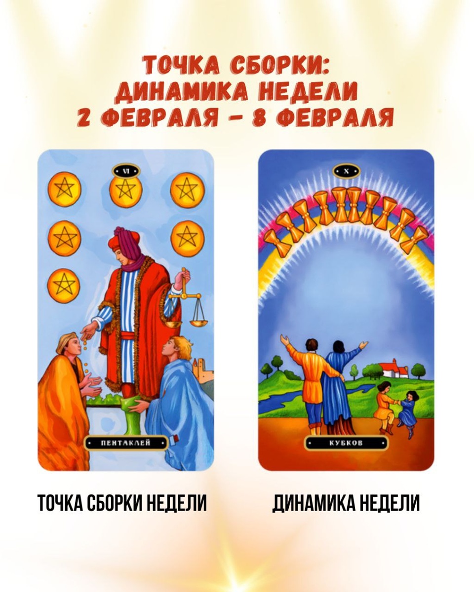 🔘🔘🔘🔘🔘 🔘🔘🔘🔘🔘🔘: ДИНАМИКА НЕДЕЛИ 1⃣ ТОЧКА СБОРКИ НЕДЕЛИ — 6 Пентаклей Внутреннее состояние недели — выравнивание и чувство справедливого обмена. 6 Пентаклей — это момент, когда ты ясно ощущаешь: где я даю из ресурса, а где — из дефицита. Эта карта про: 💕баланс «давать ↔️ принимать», 💕спокойную уверенность в своей ценности, 💕умение принимать помощь без чувства вины, 💕зрелое распределение энергии, денег, внимания, 💕ощущение: «я не обязан(а), я выбираю». Ты входишь в неделю с внутренним пониманием меры. Без жертвенности. Без перекосов. Без спасательства. Энергетическое состояние недели: Ровное, честное, зрелое. Про уважение к себе и к другим. 2⃣ ДИНАМИКА НЕДЕЛИ — 10 Кубков Внешние события недели будут разворачиваться через тему радости, эмоционального наполнения и близости. 10 Кубков приносит: 🟢тёплые встречи, 🟡ощущение «я на своём месте», 🔴гармонию в отношениях, 🔵семейные и дружеские моменты, 🟠чувство внутреннего счастья без внешнего напряжения. Это неделя, ко