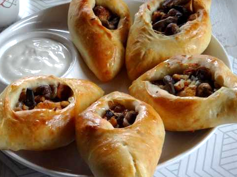 Ингредиенты: Для пресного теста: - 2 стакана муки - 100 г сливочного масла - 2-3 ст. л. сметаны, простокваши или их смеси - ½ ч. л. соды - 1 ст. л. уксуса - ½ ч. л. соли Для начинки: - 250 г предварительно отваренных свежих грибов - 1 луковица - 1 ст. л. сливочного масла - 1 ст. л. густой некислой сметаны - 1 крутое яйцо - рубленая зелень укропа и петрушки - молотые сухари - соль и молотый перец по вкусу Приготовление грибной начинки: Предварительно отваренные свежие грибы пропустить через мясорубку, добавить спассерованный в масле мелко нарезанный лук, измельченное крутое яйцо и сметану. Заправить начинку по вкусу рубленой зеленью укропа и петрушки, молотым черным перцем и солью. Всю массу перемешать и при необходимости загустить, добавив нужное количество молотых сухарей. Приготовление пресного теста: Смешать свежепросеянную муку с мелкой солью. Соду погасить уксусом и смешать с простоквашей или сметаной. Постепенно добавляя в муку размягченное сливочное масло и подготовленную сметан