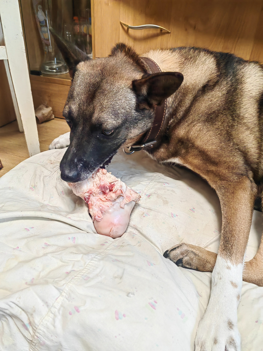 Всехний любимчик Степичка просто баловень судьбы. После того, как стали приходить деньги, вообще загордился: "Кто в доме главный добытчик?!" Каждый раз встречает меня взглядом "ЧО купила?" Такое ощущение, что не только умеет читать комментарии в Дзене, но и в курсе баланса карты, на которую приходят донаты от читателей. Вкусные косточки по заказам читателей обновляем регулярно. Причем и за старыми следит ревностно, пряча их под матрас. Пришлось подложить старую пеленку, чтобы не попортить обновку. Мясо поделили между двумя огромными собаками. Молли осмотрительно побоялась покушаться на степино сокровище. Степичка так старался, так старался... Наивно было думать, что хватит надолго. Пока шила новый матрас, читательница Маргарита решила подарить электрогрелку. Исполнили заказ и получили подарок. Спасибо огромное, Маргарита!!! Уже думаю подружиться со Степаном и греть ноги, когда в период потепления просто перестают подавать нормальное отопление. Размер просто для большой собаки. Решили с