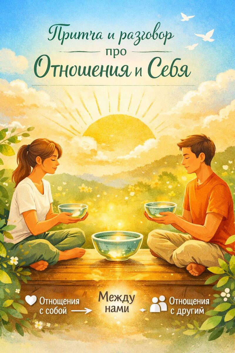 ☀️ А мы начинаем большую тему про отношения. Весна скоро😁 Притча про отношения. Один мудрец спросил ученика: — Что такое отношения? Ученик ответил: — Это когда двое держатся друг за друга. Мудрец улыбнулся и поставил между ними чашу с водой. — Отношения — это то, что появляется между. Если каждый держит только другого — вода разольётся. Ученик задумался. А мудрец добавил: — Сначала важно уметь держать свою чашу. В психологии отношения — это пространство контакта. То, что возникает между мной и другим. 🌿 Зачем они нам? Чтобы быть увиденными. Чтобы делить, а не тащить в одиночку. Чтобы рядом с кем-то лучше понимать себя. 💛 Но есть важное различие: есть отношения с собой — как я слышу свои чувства, уважаю границы, выбираю себя. И есть отношения с другим - которые почти всегда отражают то, что происходит внутри. 🧠 Здоровые отношения — это не про «нуждаться», а про встречу двух целых людей. Вопрос на подумать: 👉 Как сейчас выглядят мои отношения с собой — и что они создают в от