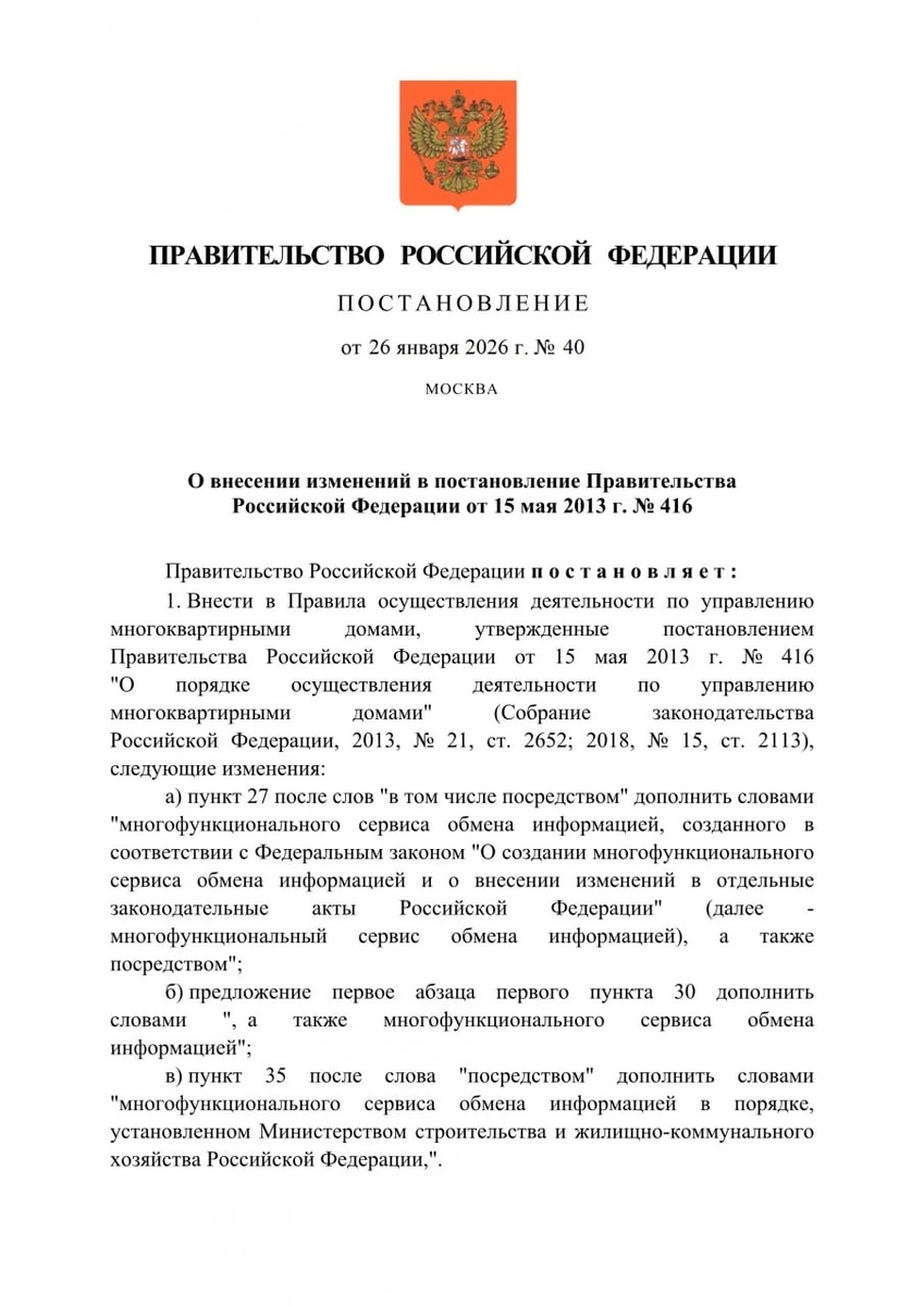 Правительство РФ утвердило Постановление от 26 января 2026 года № 40, которое вносит изменения в постановление от 15 мая 2013 года № 416 (о стандартах управления многоквартирными домами). Важно отметить, что эти изменения начнут действовать только с 1 сентября 2026 года. Суть нововведений заключается в том, что они повторяют положения Жилищного кодекса РФ, касающиеся взаимодействия через «многофункциональный сервис обмена информацией». Жители смогут отправлять свои обращения (запросы) через платформу «Макс», а порядок их направления определит Минстрой.