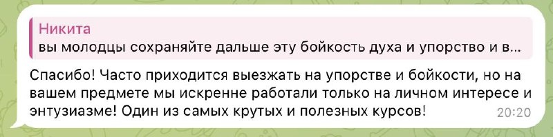 ! 🔥 Нет ничего лучше, чем живая обратная связь от студентов после курса. Друзья, недавно завершили курс по цифровым технологиям в бизнесе, и вот что говорят мои прекрасные студенты. Они не просто благодарят – они применяют знания на практике и видят реальные перспективы в этих знания! Заочный формат, очень плотный график, но ребята всё равно нашли время для занятий и передачи впечатлений — и это лучшее подтверждение ценности курса. А для меня — это лучшее подтверждение того, что теория и практика идут рука об руку и никогда, НИКОГДА не работают по отдельности. Хочу еще раз поблагодарить всех студентов за вовлеченность, отзывчивость, тягу к знаниям и конечно за честные отзывы ❤️ 💬 Что говорят студенты - Про содержание курса «Курс вышел коротким, но информативным и очень сбалансированным. Темы максимально интересные, полезные и хорошо раскрыты». - Про подачу и поддержку «Подача материала очень интересная, открытость преподавателя к любым вопросам и обсуждениям особенно поспособст